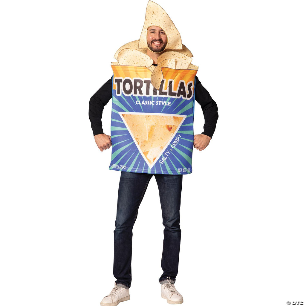 Nacho your average costume! You'll without a doubt stand out wearing this Tortilla Chips Bag Costume! The costume includes a foam tunic with a blue poly knit back and an open face headpiece. The tunic and the hat are printed on the front only. The front also has 3D tortilla chips with a slit opening in the front. The headpiece and the arms are open for easy eating and drinking. One size fits most adults.