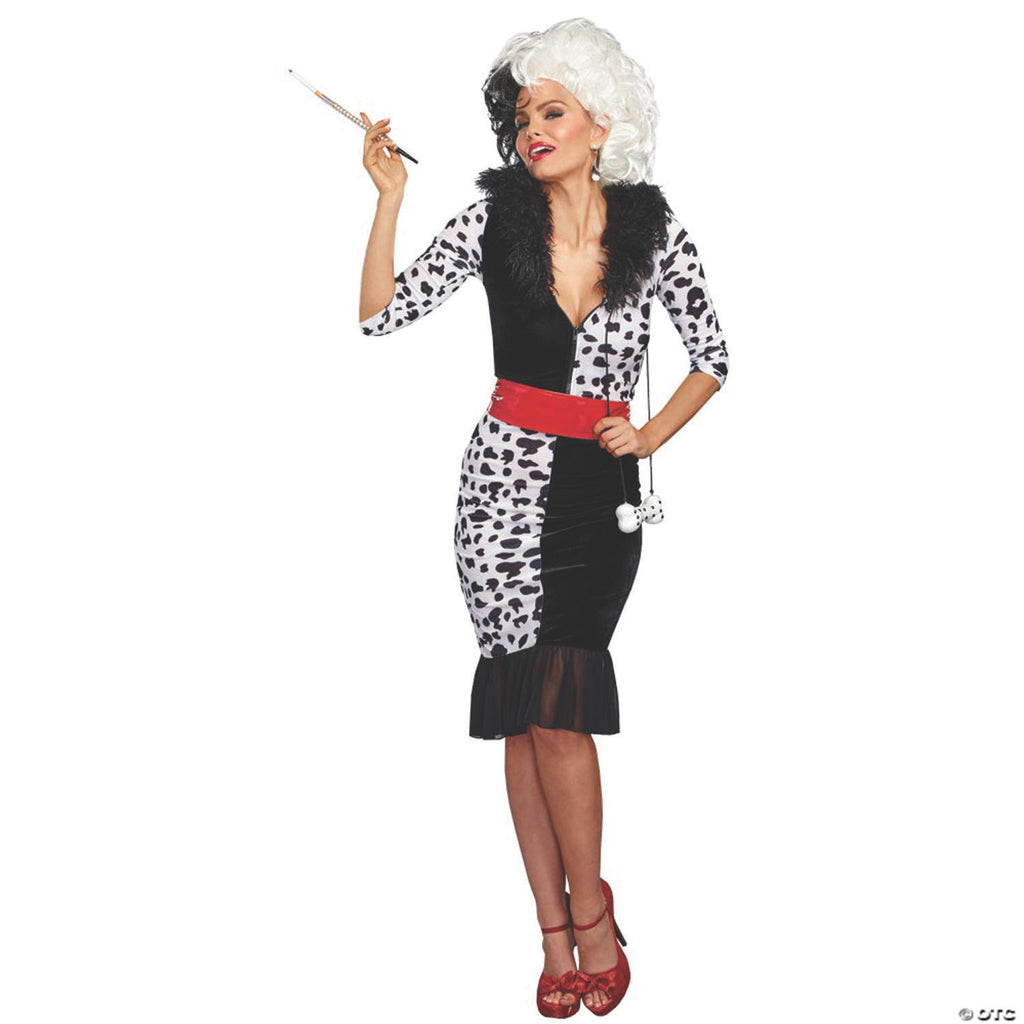 Being bad never looked so good! The flattering Dalmatian print front-zip dress with faux-fur collar has a ribbon tie back slit. A red shiny vinyl belt and dog bone accessory tie the look together for a dashing and villainous costume. Add your own wig jewelry and cigarette holder.
