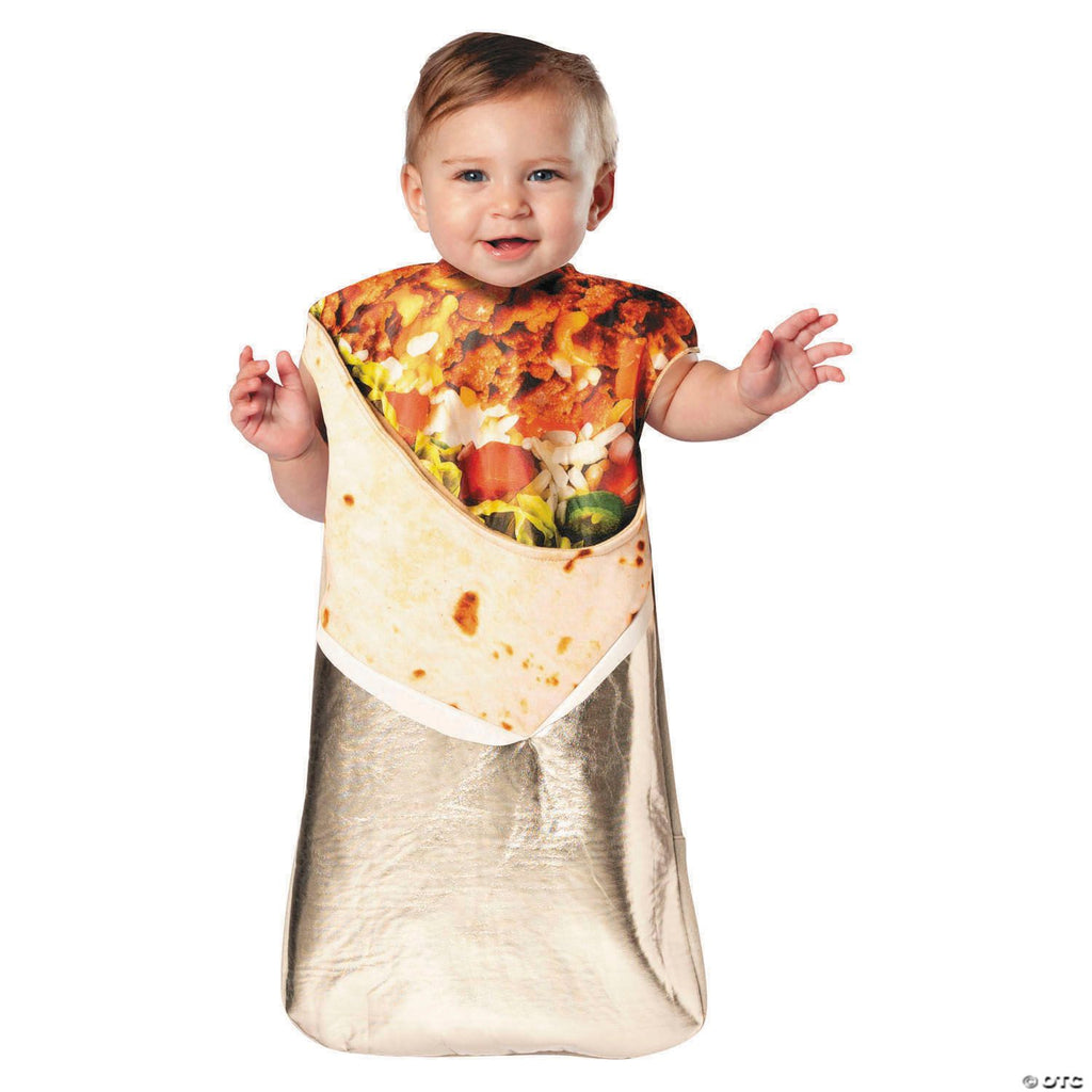 This adorable baby costume includes a one-piece bunting and features a burrito design. • Material: Polyester. • Includes bunting. • Fits most babies size 3-9 months. • Spot clean with cold water only. Do not wash, bleach, dry clean or iron.
