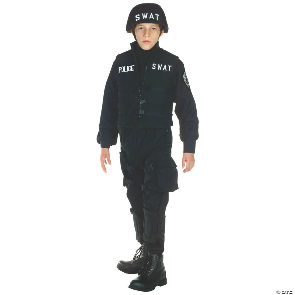 Special Forces Police Officer is trained to keep the peace! Black shirt vest and pants come with attached black holster and pouch black knee pads and hard helmet with black cover.