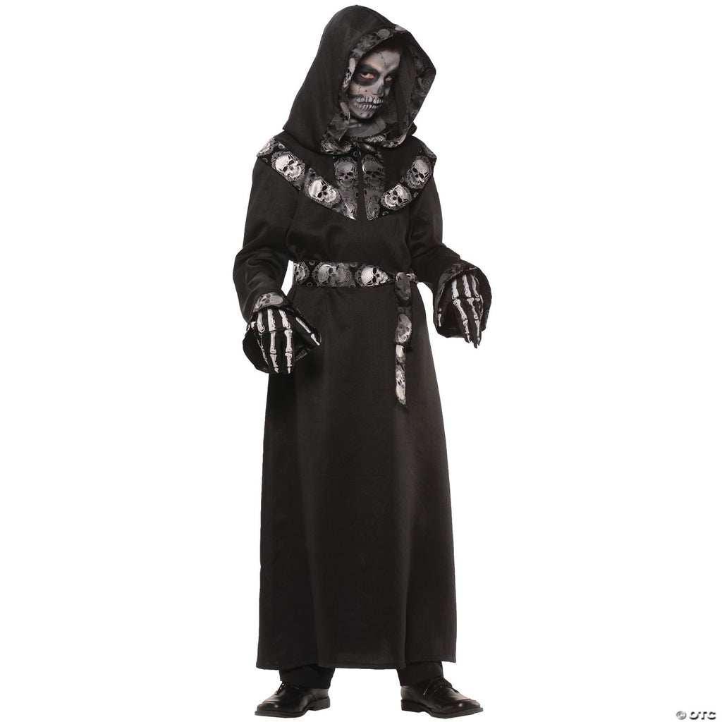 This menacing costume includes a quality black robe with attached hood that has printed skeleton trims on the sleeves collar and belt. Just add a mask or makeup and skeleton gloves to complete this look! Child Medium fits boys size 6-8.