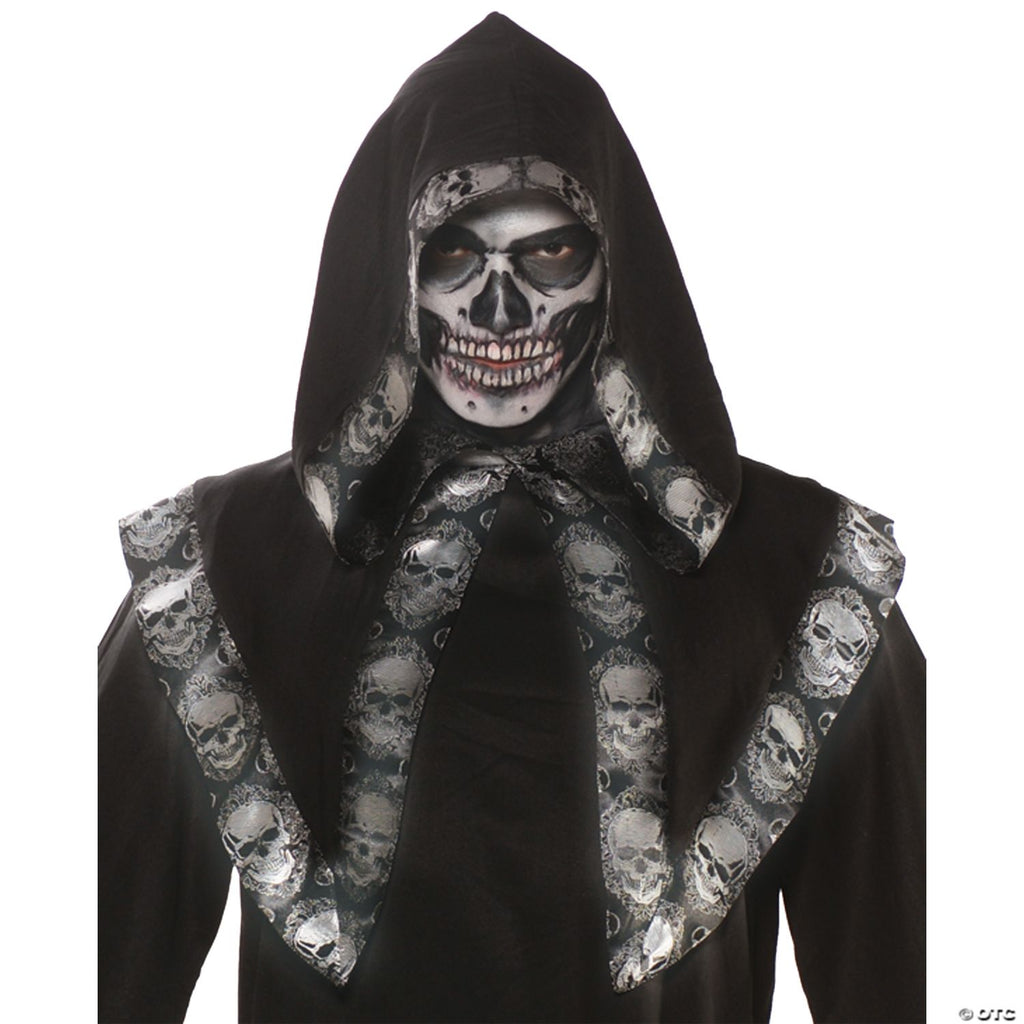 Strike fear in the heart of the stoutest soul with this amazing costume! Become the keeper of the crypt! Full length skull printed jacquard trim tunic with attached shawl and hood belt. Fits teen sizes waist 26 inches-27 inc
