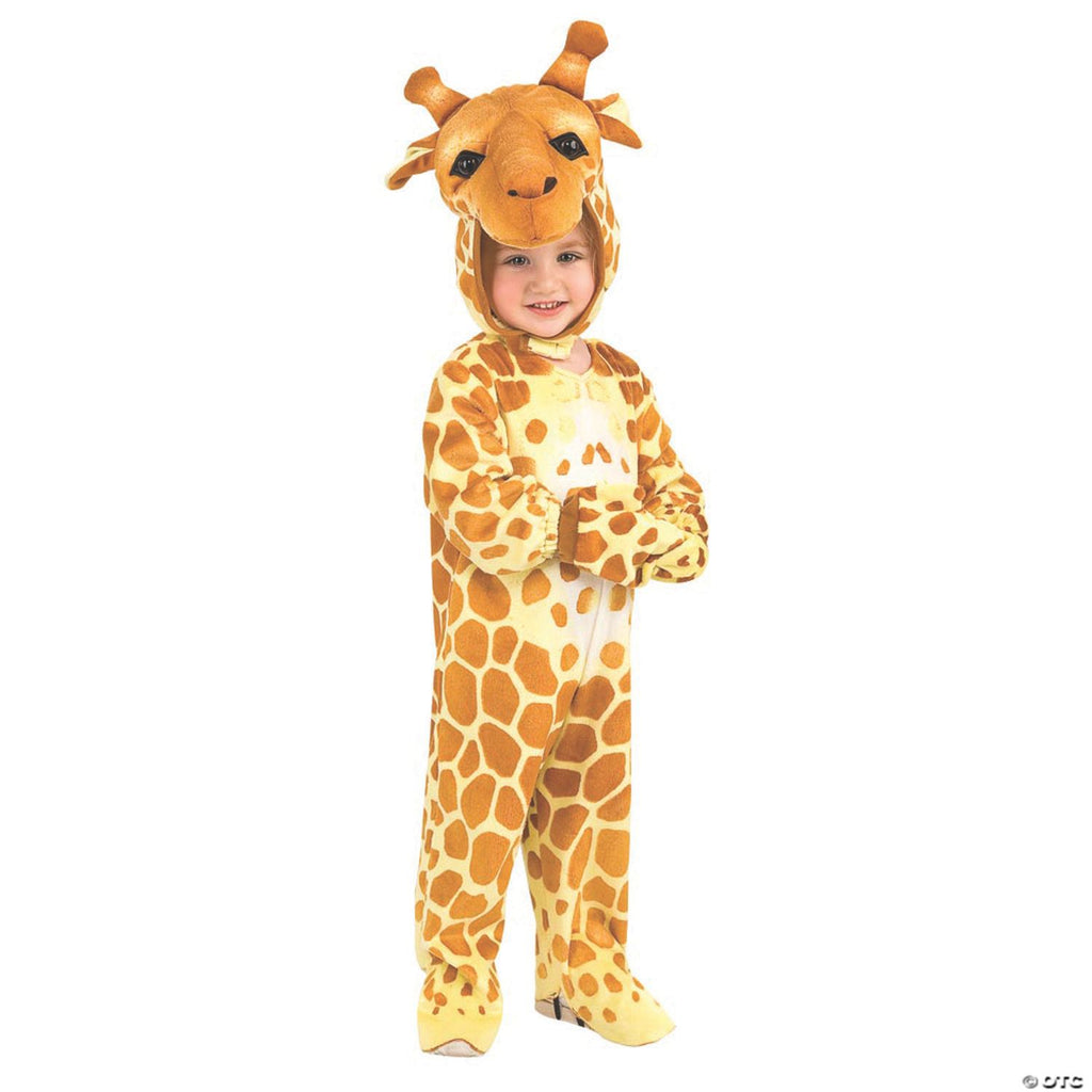 Perfect costume for your animal lover little one! Plush jumpsuit with giraffe spots comes with a stuffed giraffe headpiece and matching gloves. Toddler size 2T-4T.