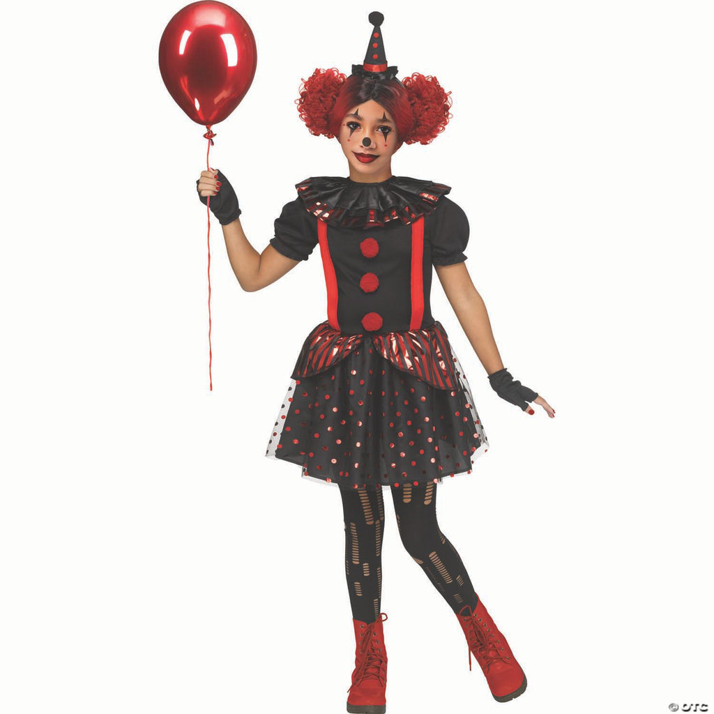 Product Description: Add a bit of dark humor to your next Halloween gathering when you wear our Girl's Chrome Clown Costume! Metallic hot foil accents appear on a dress made of elegant mixed materials with a black and red color theme. Comes with a separate matching collar, black fingerless mitts, and a matching mini clown hat headband. Wig, makeup, stockings, shoes, and balloon are sold separately. Made of 100% polyester. Spot clean with damp cloth, then air dry. Do not bleach, do not dry clean.