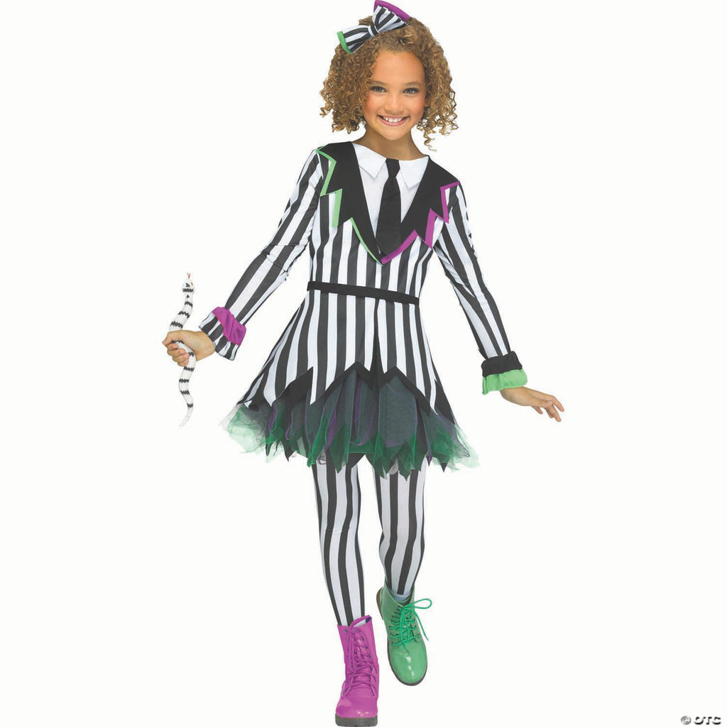 • JOIN FRIENDS IN THEME COSTUMES: Coordinate costumes with friends for a themed group look, creating a sense of unity and camaraderie, and making Halloween celebrations even more enjoyable and memorable. br • STAND OUT AT COMMUNITY EVENTS: Dress up your kids in their Halloween costumes for community events, such as parades or festivals, where they can showcase their creativity and delight everyone with their adorable and unique looks. br • BE THE TALK OF THE NEIGHBORHOOD: Dressing your kids in eye-catching costumes will make them the talk of the neighborhood as they strut their stuff on Halloween night, turning heads, and receiving compliments from everyone they encounter. br • HAVE FUN AT COSTUME PARTIES: Attending costume parties during the Halloween season is a blast for kids, as they get the chance to show off their costumes, dance, play games, and enjoy a night filled with laughter and fun. br br Product Description:br Great look for your next Halloween costume party! Our Girl's Silly Spirit features a cute black & white jacket dress with pink and green trims and a multilayered skirt with green & black mesh panels, and comes with a detachable black tie, matching striped footless tights, and a matching striped bow on a headband. Shoes and snake are sold separately.