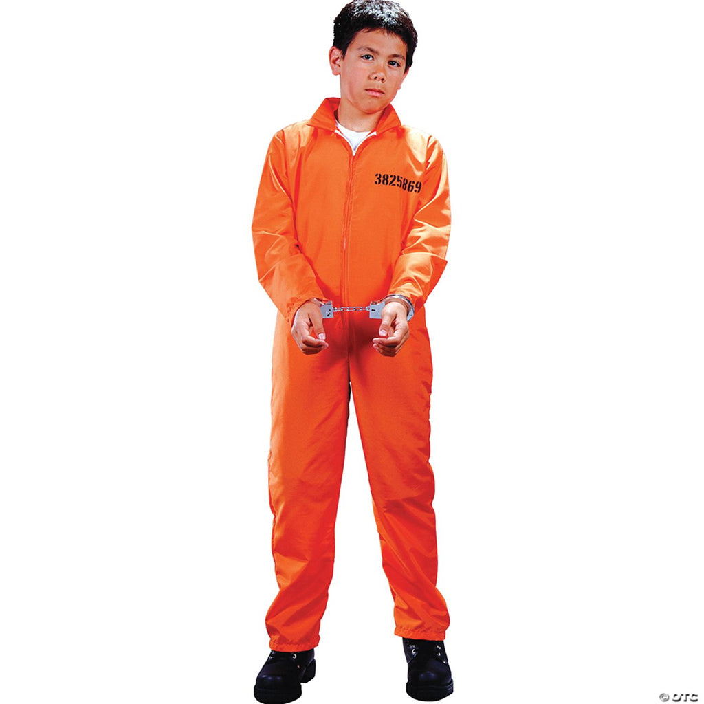 Printed one-piece orange jumpsuit with zipper enclosure. Handcuffs with key included. Handcuff color may vary.