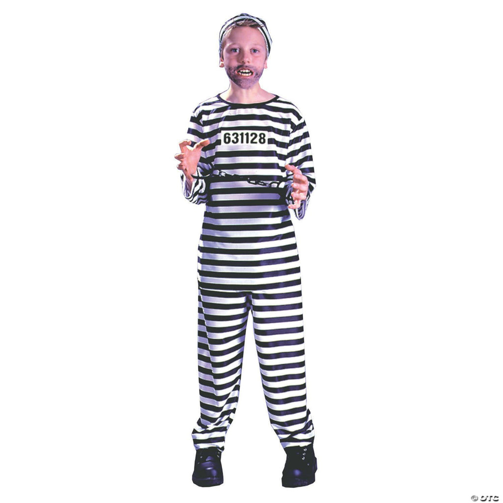 Striped shirt with convict number, striped pants, and, convict hat. Shackles not included.