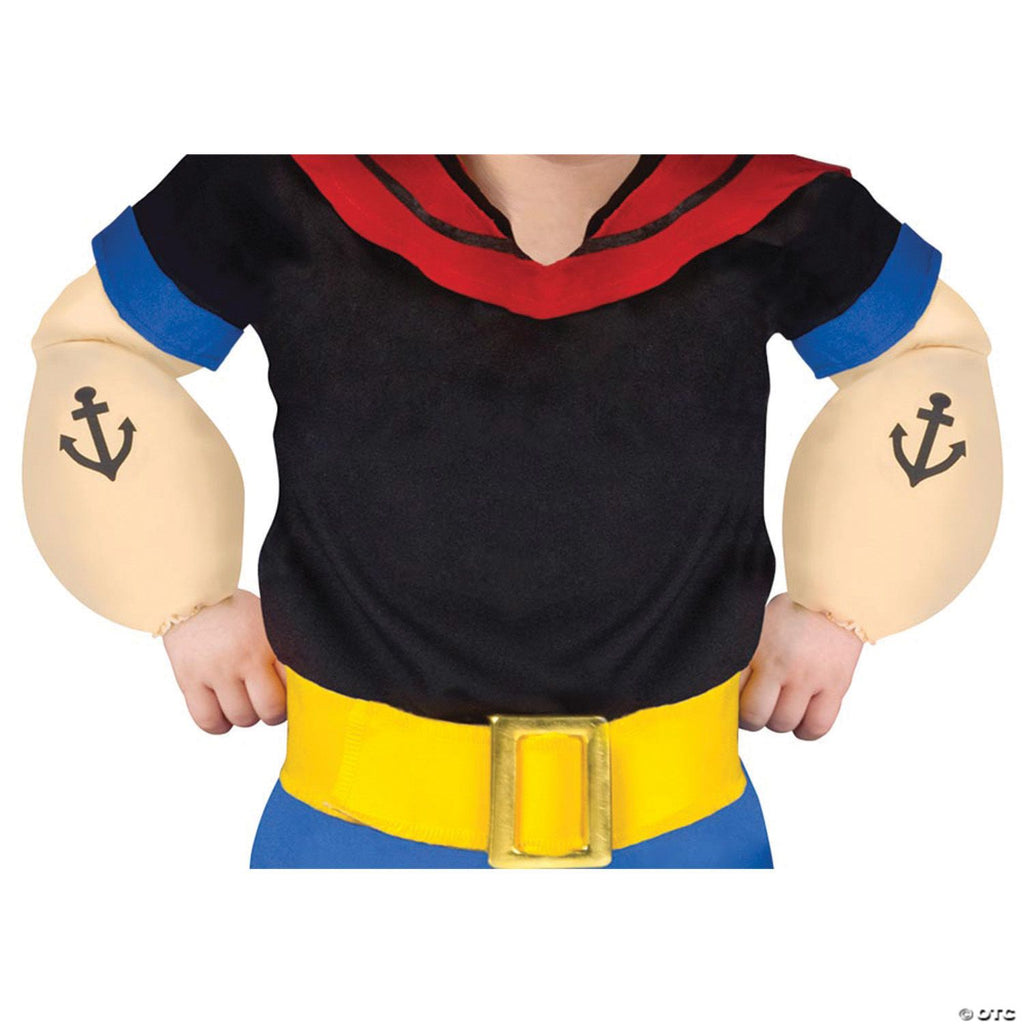 Blue pants with yellow belt, black shirt with red collar, muscle arms, and sailor cap. Fits 3T to 4T.© 1996 King Features Syndicate, Inc. TM of the Hearst Corporation.