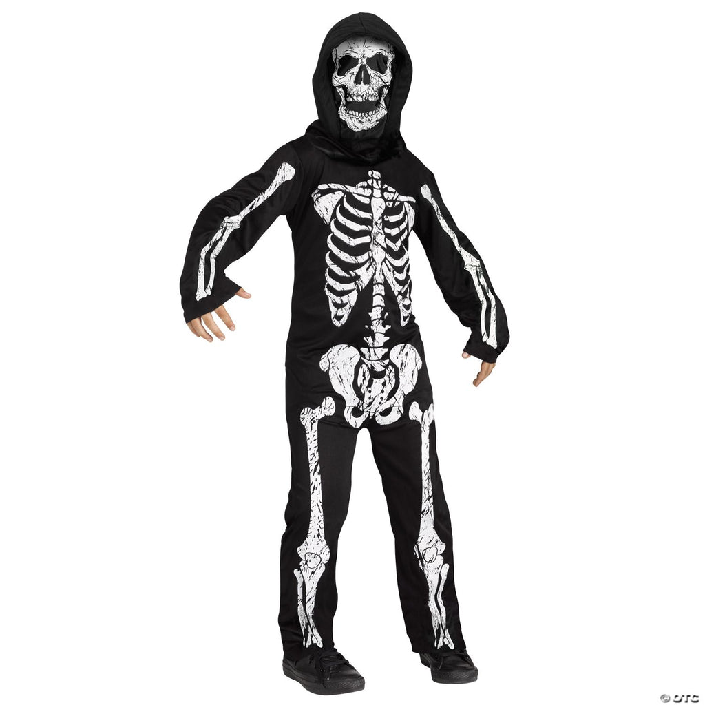 A cool skeleton costume that will allow your child to scare all of his friends and neighbors! Jumpsuit with white printed skeleton and hood with skull-printed mask.