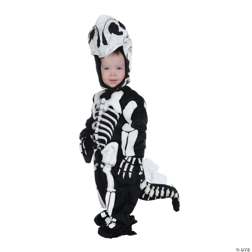 Your dinosaur fan will love this costume! Black jumpsuit with screen-printed dino bones on the front and back has attached feet hood and mitts. Soft spinal plates go all the way down the back and the tail. Comfortable to wear!