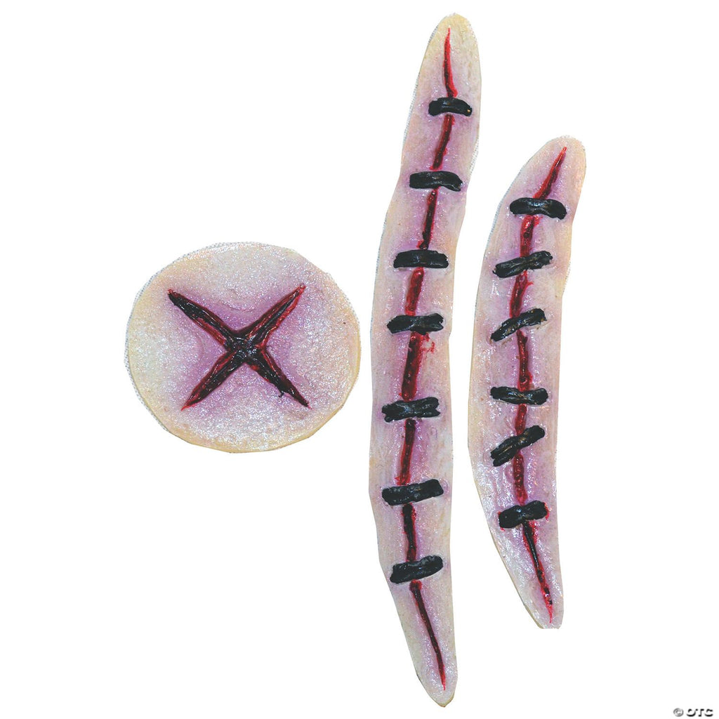 • STEAL THE SHOW: These show-stopping costume prosthetics features three gashes that include two long ones showing red scars with staples and one round one in an "x" pattern.br