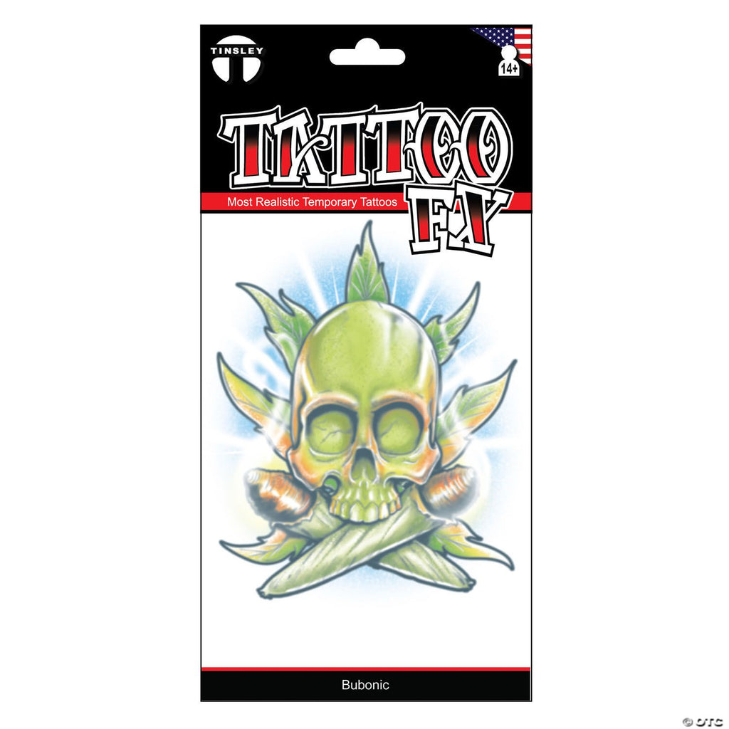 Channel your inner rebel with Bubonic Temporary Tattoo from the Tinsley 420 collection. This edgy design is not for the faint of heart, featuring a skull surrounded by a ring of detailed pot leaves and a perfectly rolled blunt. • Includes 1 Tattoo FX measuring 4" x 6" • Easy to Apply: Goes on in seconds with just a little water and lasts for days. • Made with non-toxic, cosmetic-grade ink. • Effortless Removal: When ready for a change, simply use rubbing alcohol or baby oil to remove it.