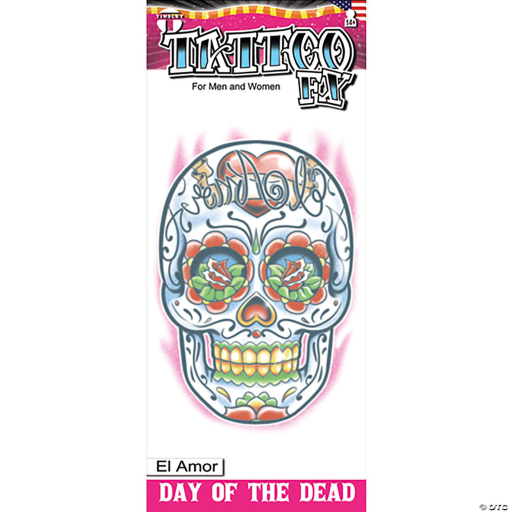 Create a great look with this Day of the Dead – El Amor – Temporary Tattoo when going out for fun, to a concert, dancing at the club, the gym or just about anywhere. • Includes 1 Tattoo FX measuring 10" x 4" • Easy to Apply: Goes on in seconds with just a little water and lasts for days. • Made with non-toxic, cosmetic-grade ink. • Effortless Removal: When ready for a change, simply use rubbing alcohol or baby oil to remove it.