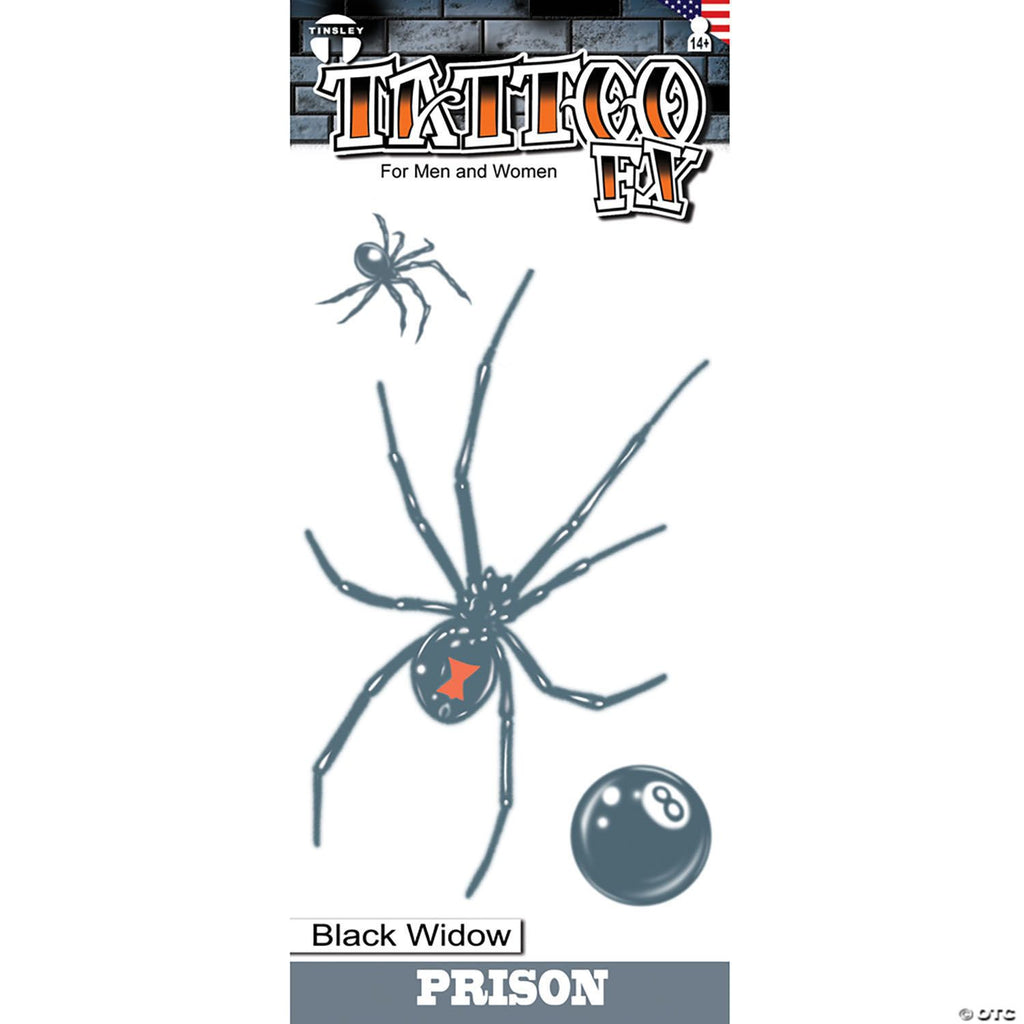 Tinsley Transfers' Black Widow Tattoo features a menacing black widow spider with the familiar red hourglass on the back along with an 8-ball and a smaller spider. • Includes 1 Tattoo FX sheet measuring 4" x 10". • Easy to Apply: Goes on in seconds with just a little water and lasts for days. • Made with non-toxic, cosmetic-grade ink. • Effortless Removal: When ready for a change, simply use rubbing alcohol or baby oil to remove it. Or remove from dry skin using several pieces of transparent household tape.