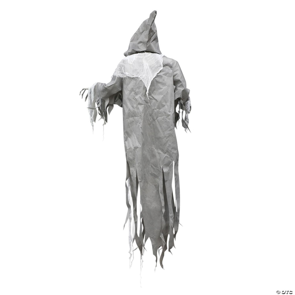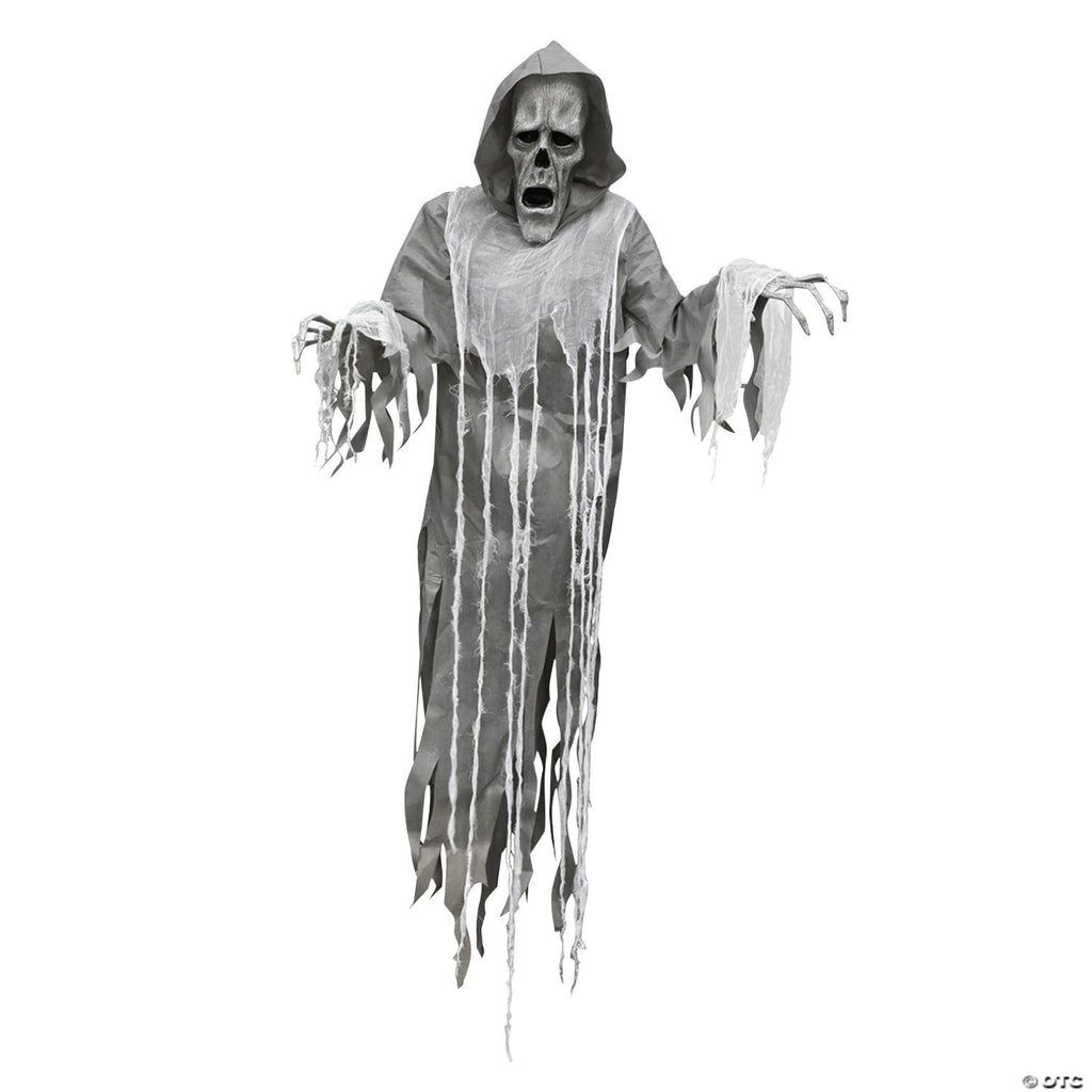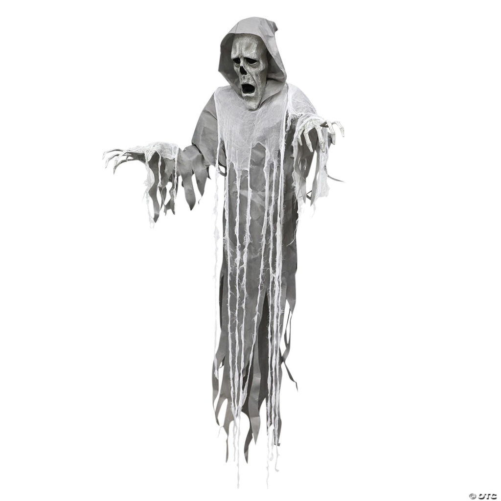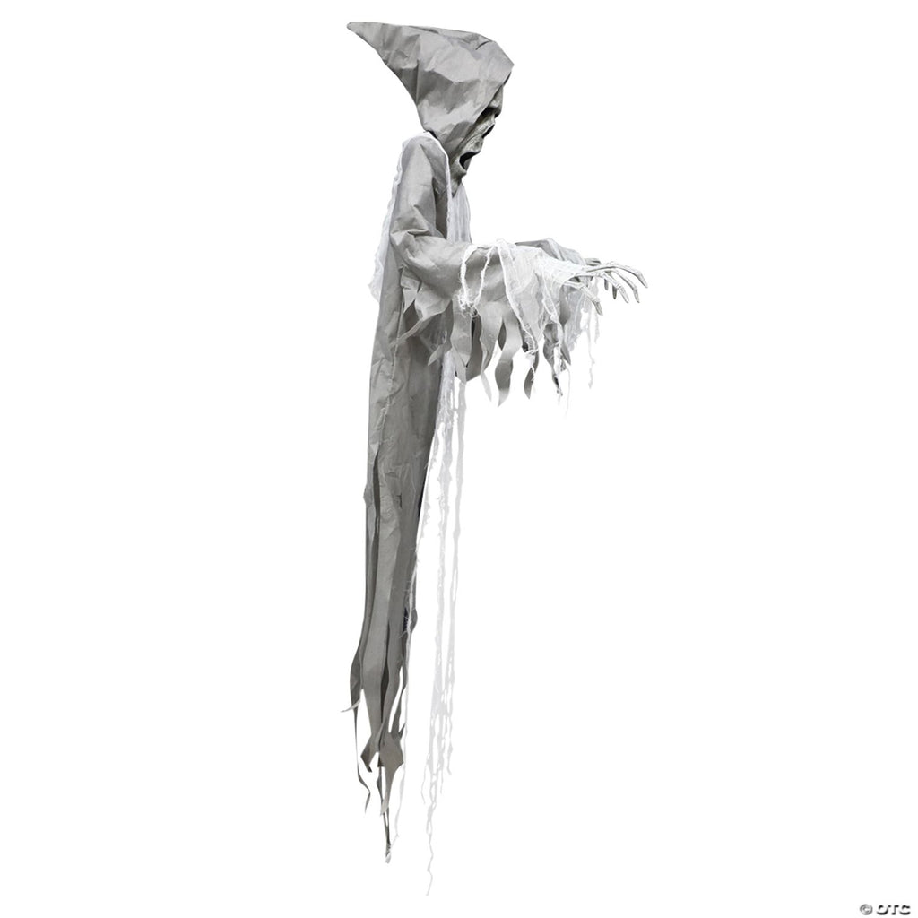 This 72-inch Hanging Reaper life-sized prop has blow-molded elongated head and hands with poseable arms light-up eyes and a tattered costume with hood and gauze details. There is a motion-sensor activation for the sounds he speaks and there is a volume control. He makes creepy moaning sounds! Just the scary prop you need for your Halloween setting! Takes 3 AA batteries which are included. Made of plastic metal, and cloth.