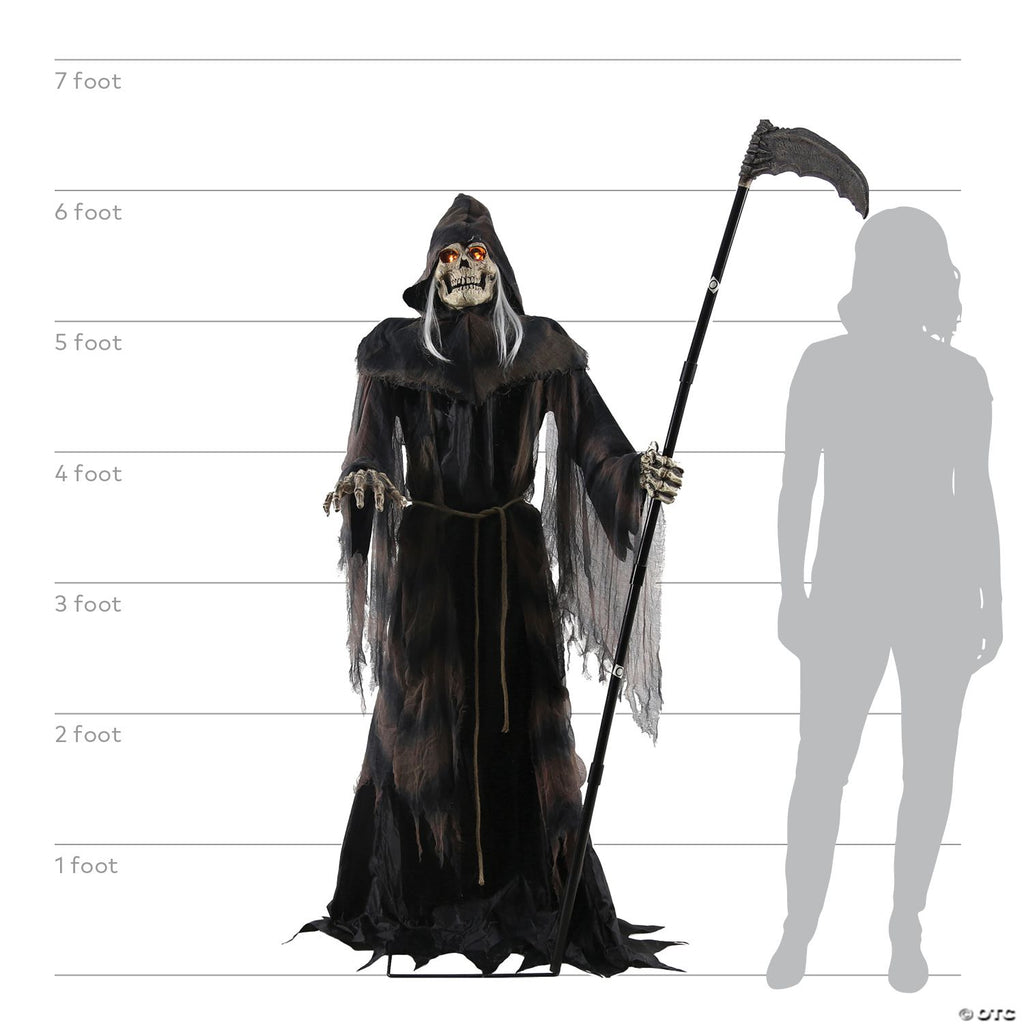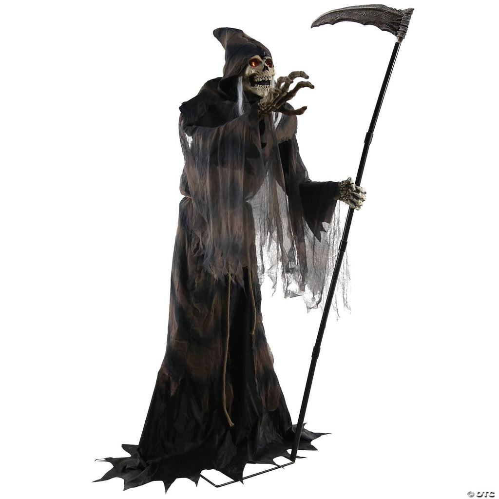 Do you not fear The Reaper? This terrifying 6' character features a soft-PVC death's head skull with yellow LED light-up eyes easy-to-assemble metal frame slush-PVC skeletal hands and plastic reaper's scythe and has a black and gray fabric hooded costume with shredded-gauze details. Plug the UL power adapter into any standard outlet and choose from Steady-On, Infra-Red Sensor or Step-Here Pad (included) activation options to operate. Once activated, the Lunging Reaper's eyes will light up with an other-worldly glow as he lunges towards you while saying one of four sayings. The infra-red sensor works up to 6.5' feet away and works in all lighting conditions - bright light to no light! Item includes volume control. Easy-to-assemble quick-connect poles, assembly required. Approximately 6 feet tall.