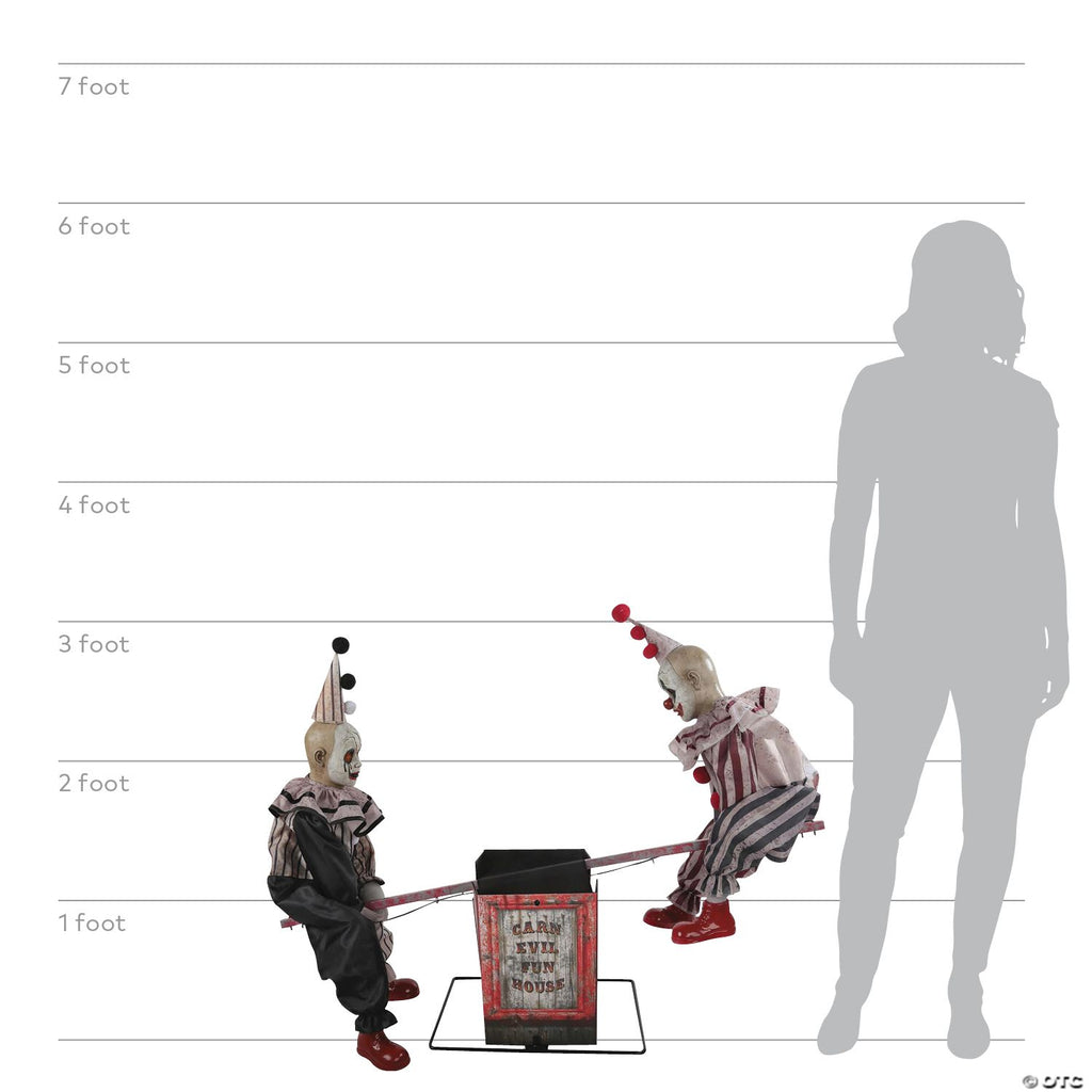 Give an eerie melancholy mood to your Halloween scene when you bring home the See Saw Clowns Animated Prop! Two vintage clown dolls with hollowed-out eyes are slowly riding up and down on a see saw while a chilling tune plays! Choose from Steady-On Infra-Red Sensor or Step-Here Pad (included) activation options of operation. The infra-red sensor works up to 6.5 feet away and works in all lighting conditions - bright light to no light! UL power cord is included. Includes volume control. Assembly is required. Materials: polyester PVC sponge, plastic, hemp rope, electronics. Measures approximately 36 inchesH x 48 inchesW x 13 inchesD.