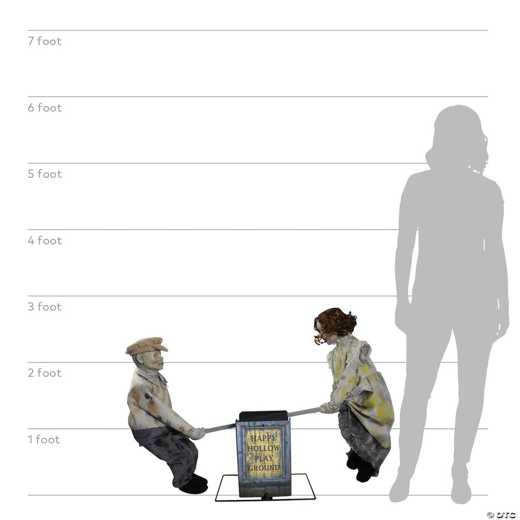 Forgotten and forsaken these creepy dolls are left to seesaw alone for all time. This haunting prop features two Victorian dolls with hollowed-out eyes slowly riding on a seesaw while a chilling tune plays! Prop is easy to assemble and will add an unnerving effect to your Halloween decor. Great animated Halloween prop to add to your haunted house! Activation options: steady-on Step-Here pad and infra-red sensor (works up to 6.5 feet away and works in all lighting conditions). Standard UL power adapter. Polyester PVC, sponge, plastic, electronics. Assembly required. 36 inchesH x 48 inchesW x 13 inchesD.