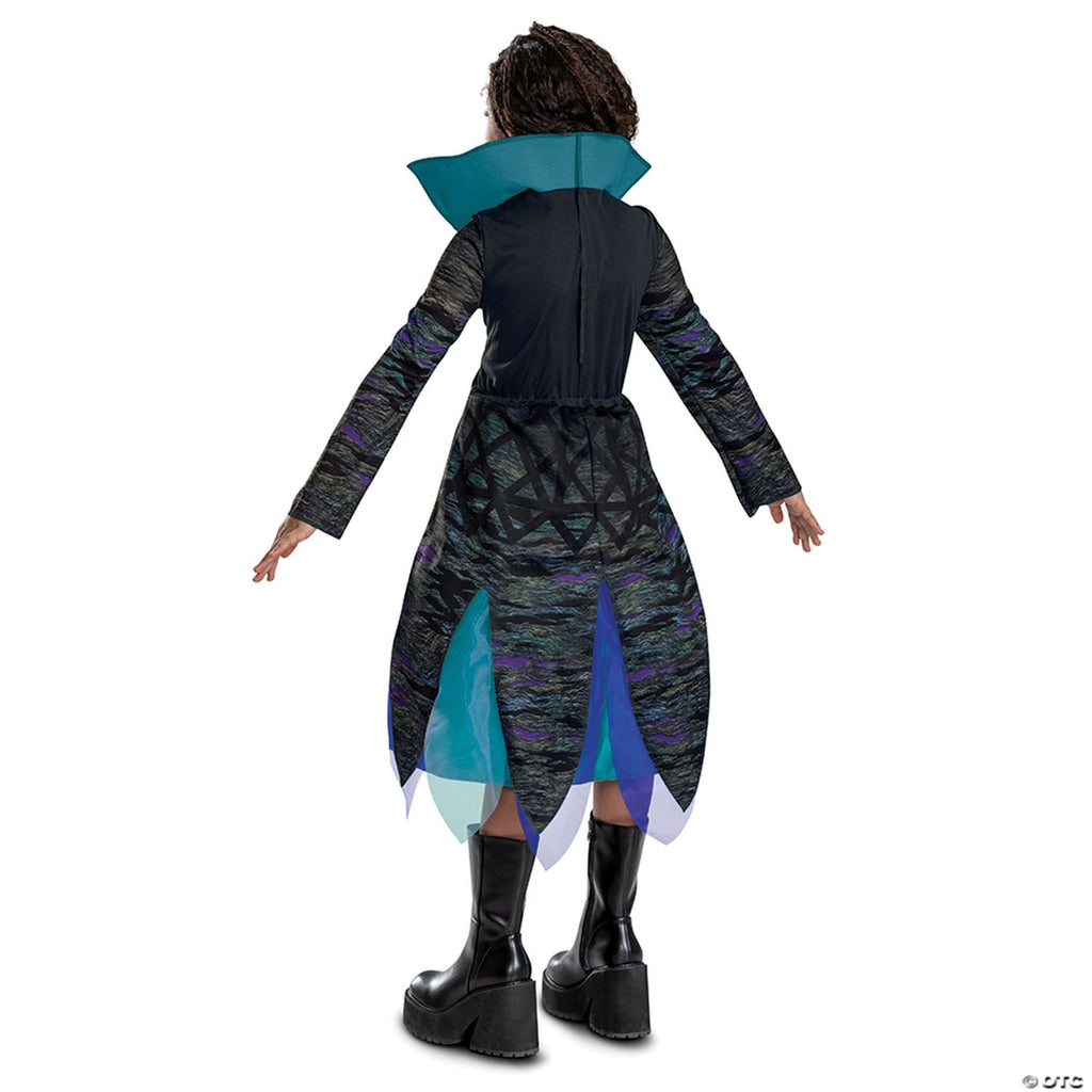 From the Disney movie, Descendants 4: The Rise of Red, look just like Uliana, the beautiful teen sea witch, younger sister of Ursula, and mean-girl bully leader of her own gang at Merlin Academy! Our Girl's Uliana Deluxe Costume features a lovely black character dress with purple and turquoise accents and printed details, flared long sleeves, and a petal-paneled multilayered skirt. The panels give the impression of tentacles. Shoes are sold separately. Made of 100% polyester. Hand wash cold. Do not bleach. Line dry. Cool iron if needed. Do not dry clean. © Disney.