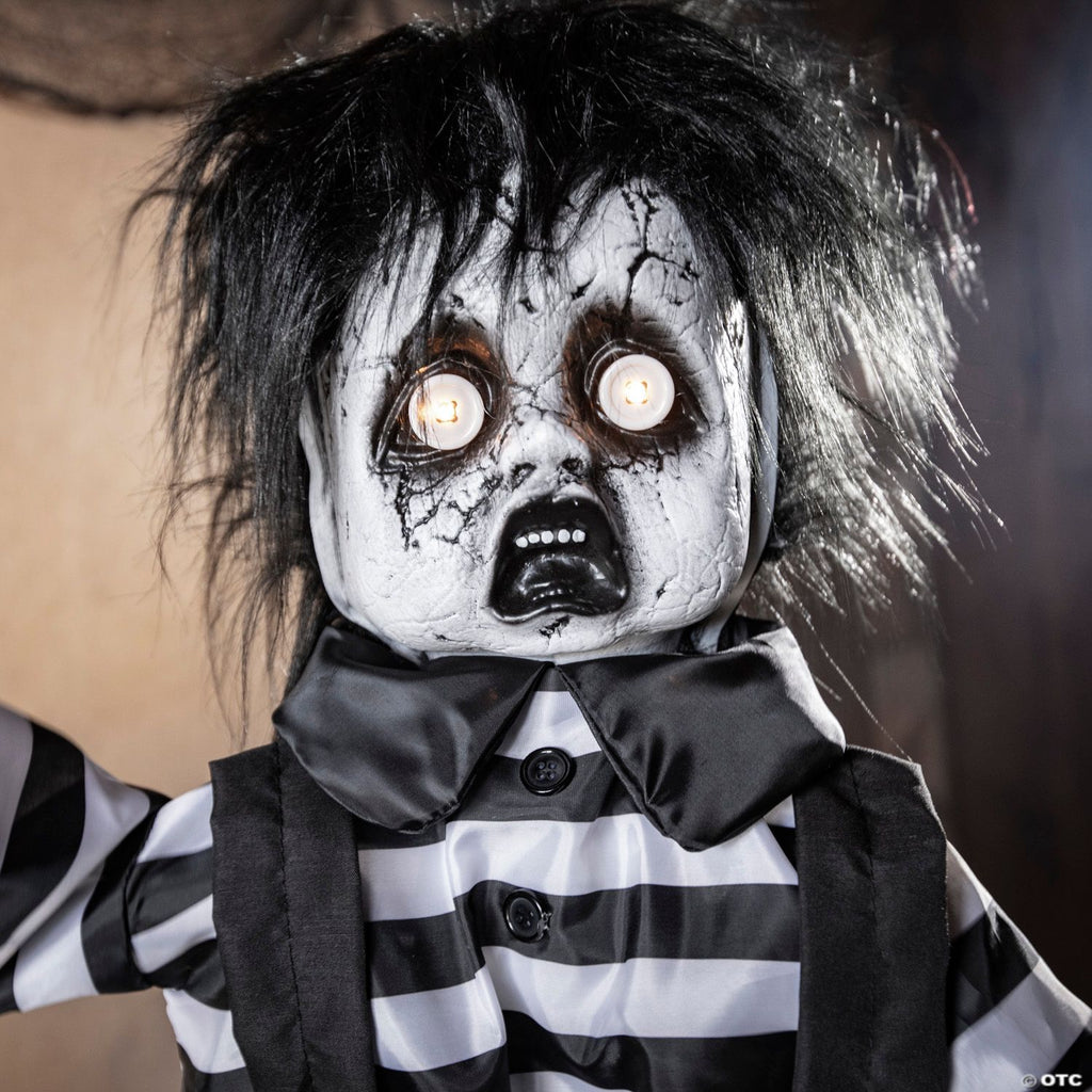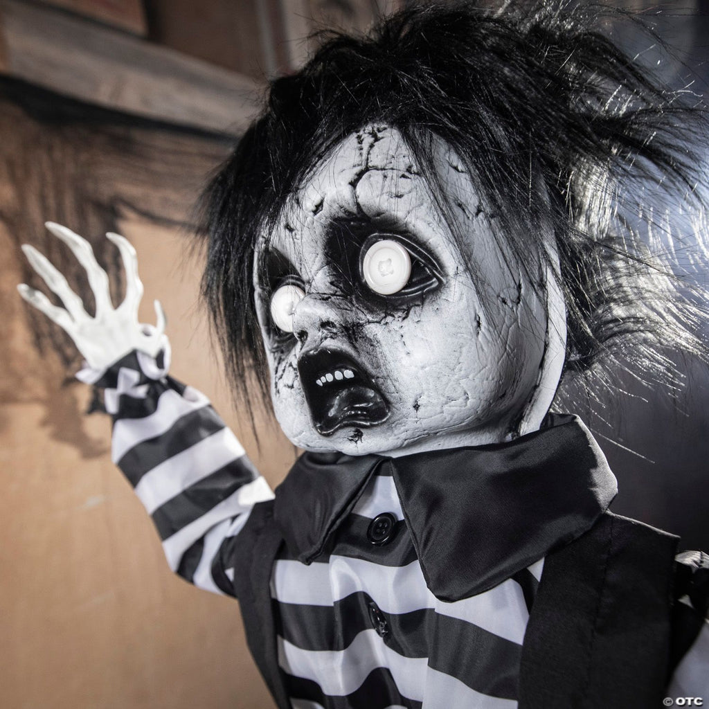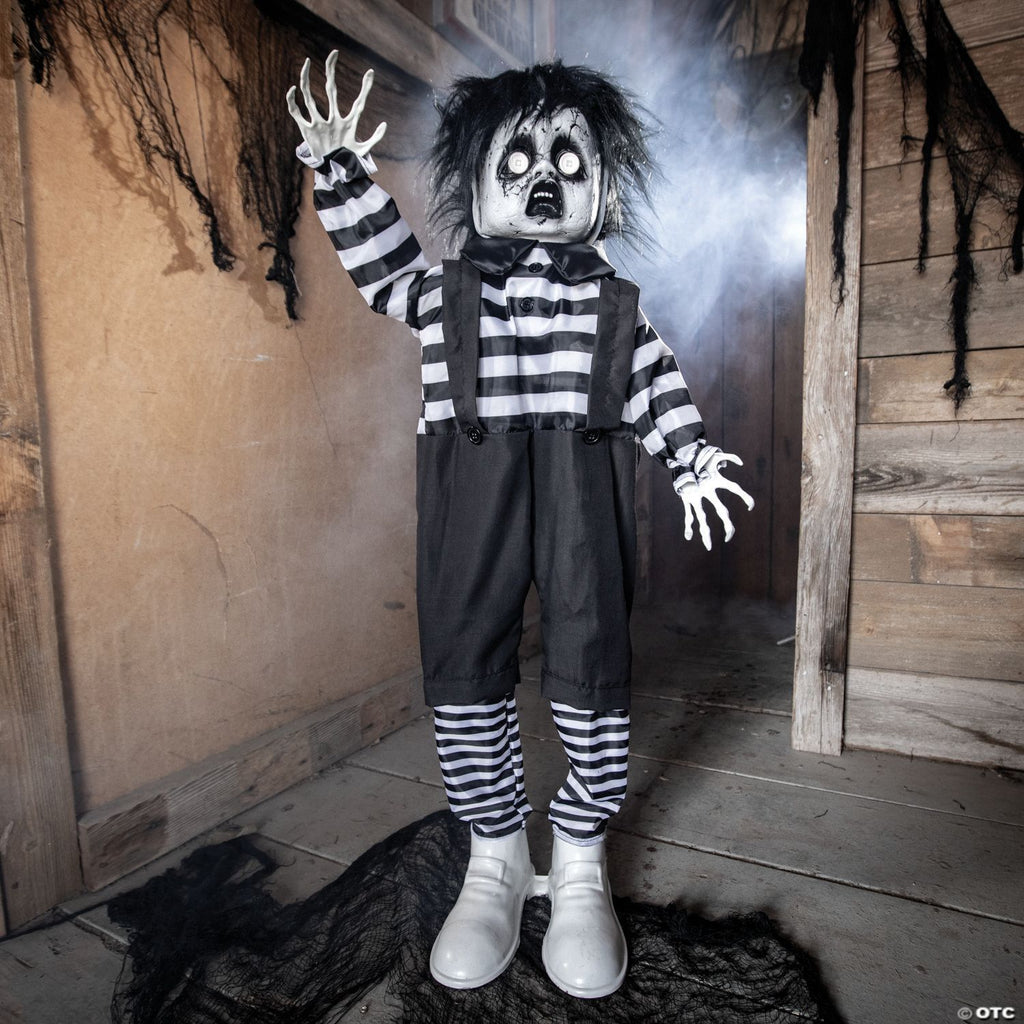 This little boy wants to play but his looks will scare people away! This standing Halloween decoration features a boy dressed in black and white clothes with a black and white face, black hair and large shoes. His open-mouthed expression makes him look surprised, but this animated decoration has a surprise for passersby. He will startle them by creepily laughing and playing a music box as well as speaking the following phrases: “Do you wanna play? Come closer. I’ve got a secret.” Legs can extend to raise height. Batteries required. 2 ft.