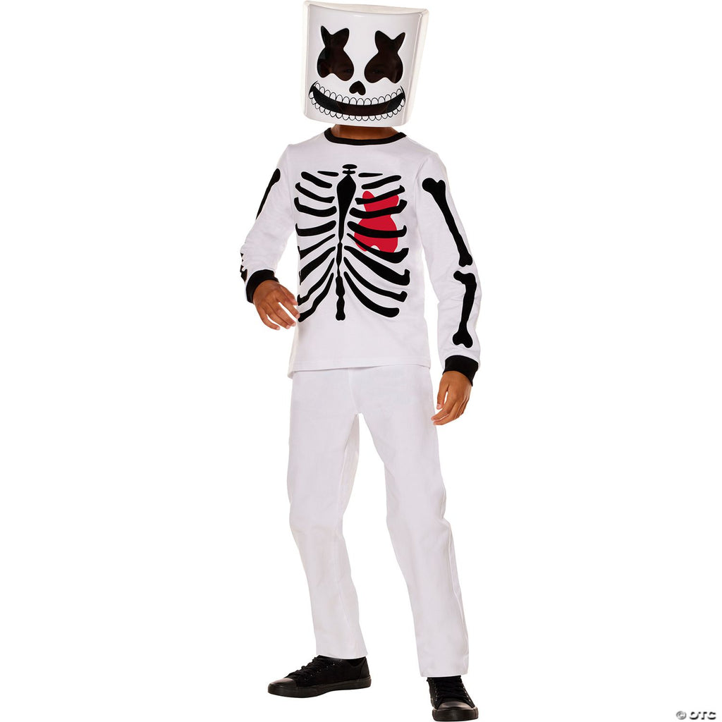 Keep the crowd moving to the beat all night long when you show up to the party wearing this officially licensed Marshmello Skeleton Youth Costume. Everyone will be wondering "who's under that mask?" once you show up wearing our Marshmello mask and matching shirt. Includes: long-sleeved polyester shirt that is printed front and back and a molded plastic half mask with mesh eyes for visibility. Hand wash cold, air dry. Do not bleach, do not dry clean. Pants and shoes are not included. All trademarks and copyrights are the property of Marshmello Creative, LLC.