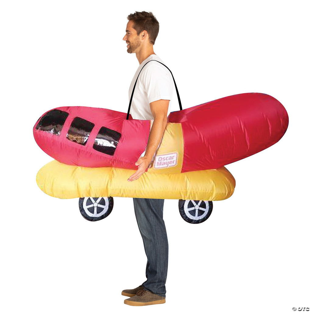 The big dog you will relish! Relish in your love of hot dogs wearing this Oscar Mayer Inflatable Wiener Mobile Halloween Costume! The costume includes an inflatable costume with straps for easy wear and a battery fan. One size fits most adults.