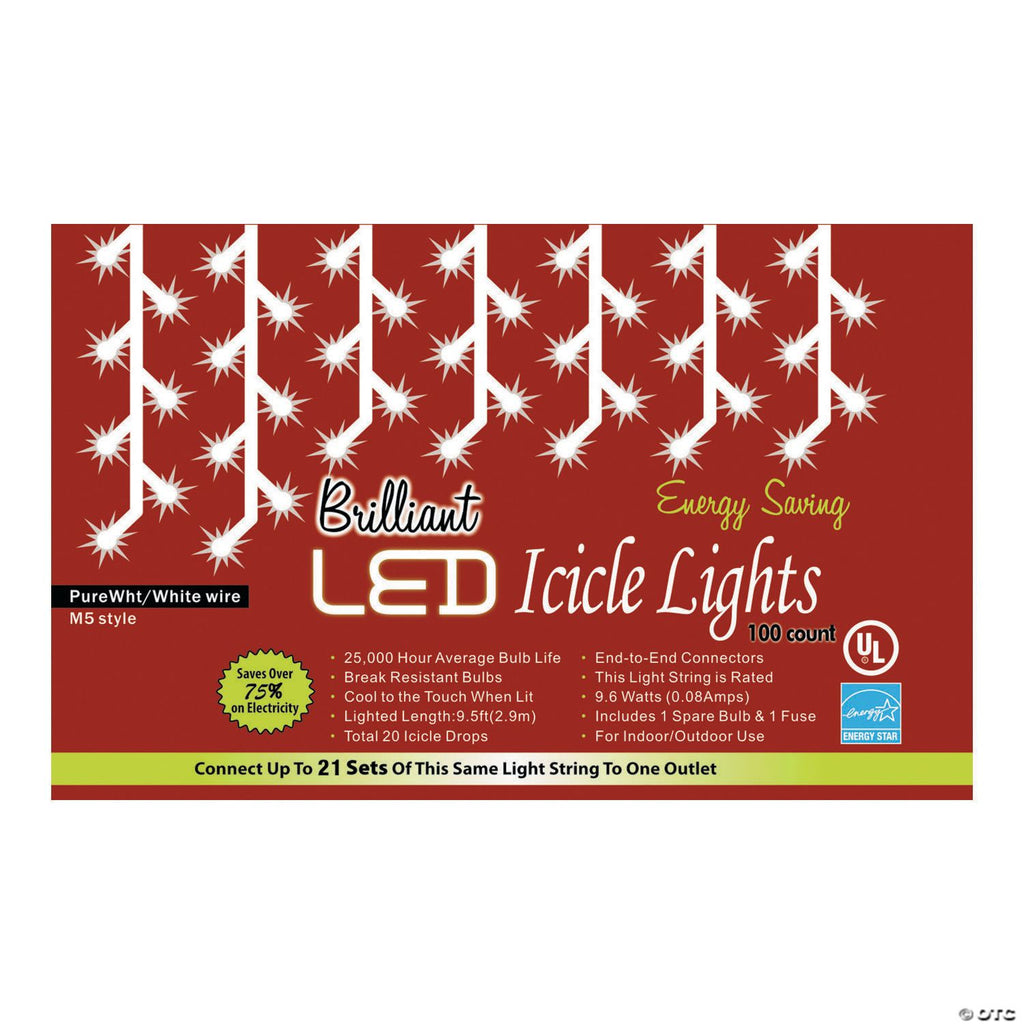 Icicle light set perfect for Christmas or party decoration! 20 icicle drops that are brilliant LED lighting. Pure white light on a white cord with 6 lead /6 drop sp/4 cut/6 end 6L+4L drop pattern 9.5 ft. lighted length/10 ft. total length. Rated: 9.6 watts (0.08amps)/set 3.0A/120V Fuse Spare: 1 bulb/1 fuse. For indoor/outdoor use. Connect up to 21 sets of the same light string to one outlet.