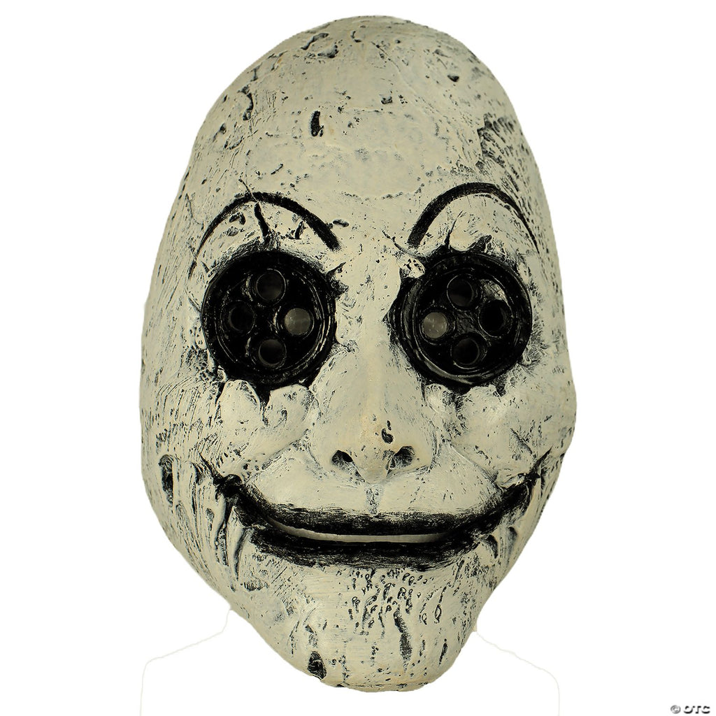 The creepy, macabre Button Eyes Latex Face Mask has an evil grin that is perfect for a horror movie, scary Halloween Costume, or a Haunted House. The pockmarked face appears to be wearing white cracked pitted makeup. The black button-look eyes look disturbing, but provide good visibility. Holes near the nose allow free breathing. A wide elastic strap holds the mask securely in place, Made of a base of black latex for greater depth and durability. One size fits most Adults and Teens.