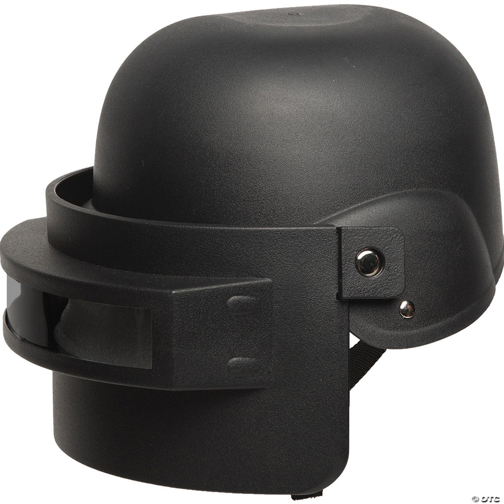 When you need a truly heavy duty costume headwear accessory option, look no further than this authentic looking SWAT helmet! 100% black plastic SWAT helmet features textured molded PVC construction, flip-up face shield/visor with dark tinted eye window slit, and black nylon chin strap. Metal rivets hold the visor in place. This is not an actual protective or safety device.