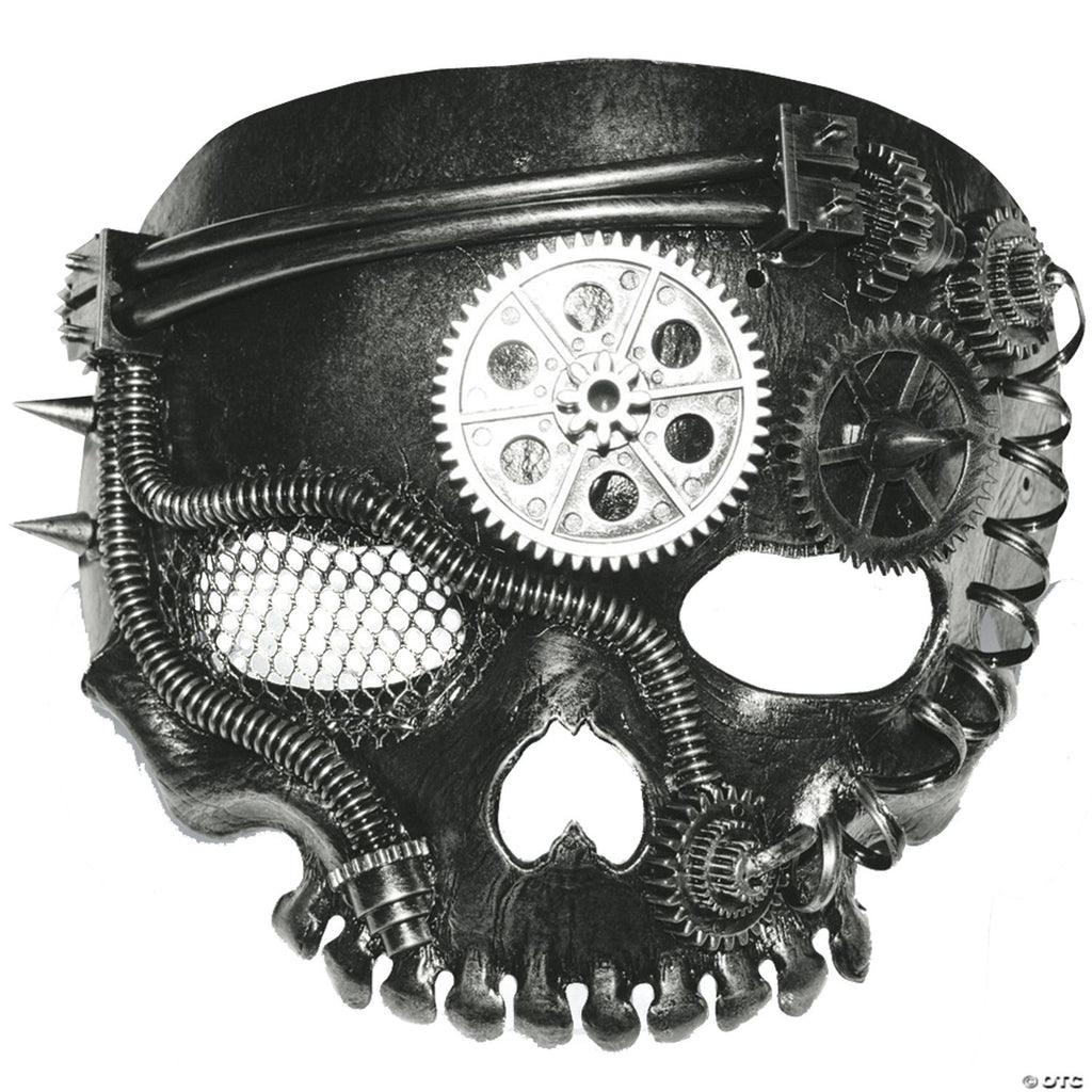 This mask is an interesting mix of both steampunk and horror! Mask is metal-like and skull shaped without the jaw, with mesh over one of the eyeholes and a large silver gear in the middle of the forehead. One size fits all.