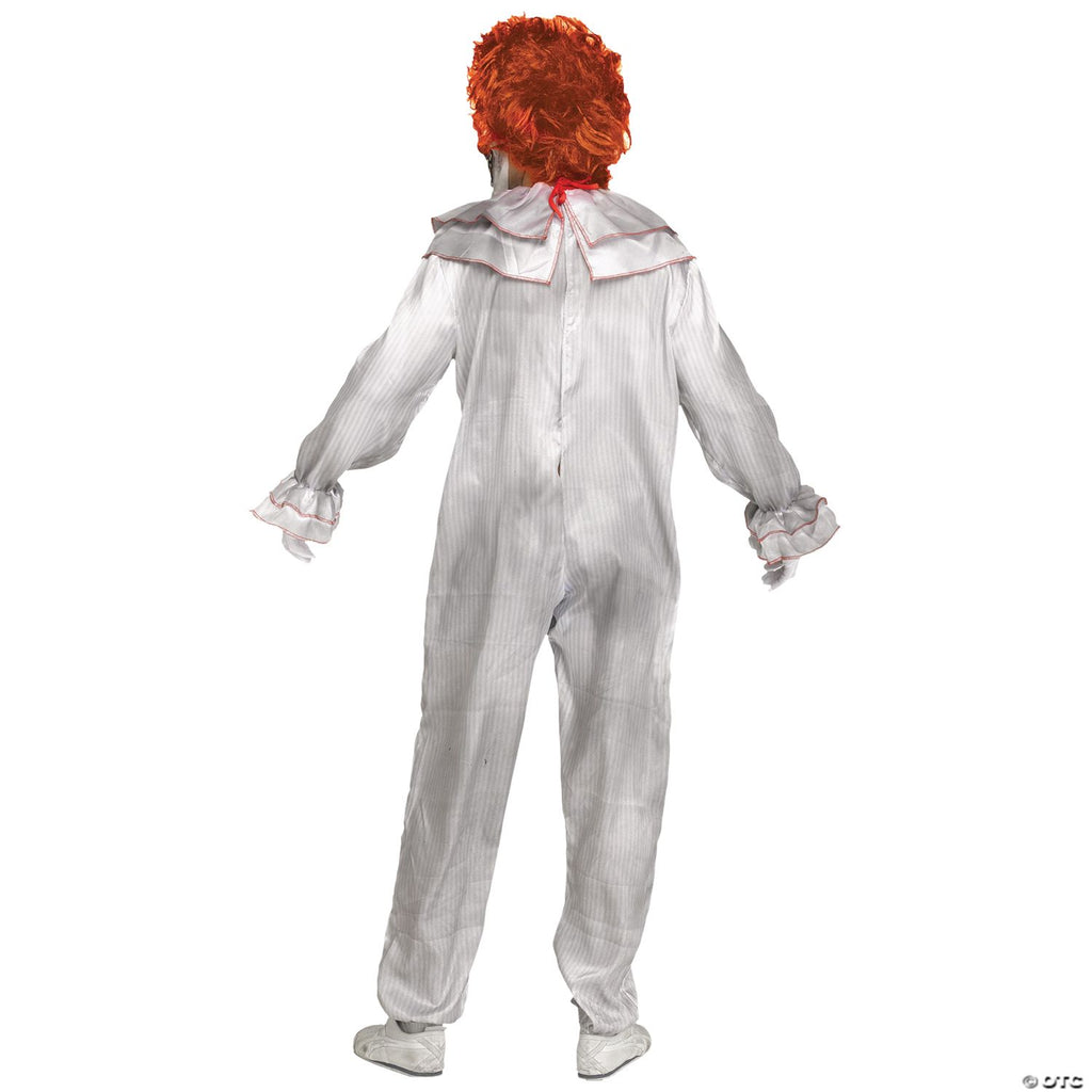 His wide deranged smile will clue you in this is no circus clown, but an entity all of its own. Silver jumpsuit with horizontal striping with 3 red pom poms down middle of suit, collar and mask. One size fits 6'/200 lbs.
