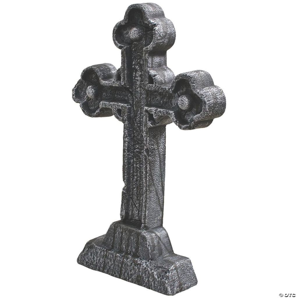 Looks like the real thing! Lightweight polystyrene foam tombstone with realistic weathered-stone look includes 2 plastic ground stakes. Perfect for any haunted house graveyard or tomb! 24in tall x 16in wide x 3in deep.