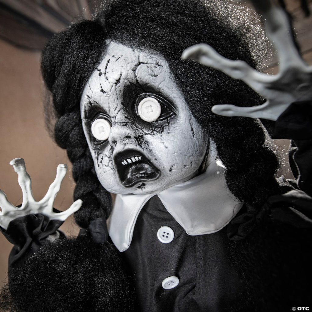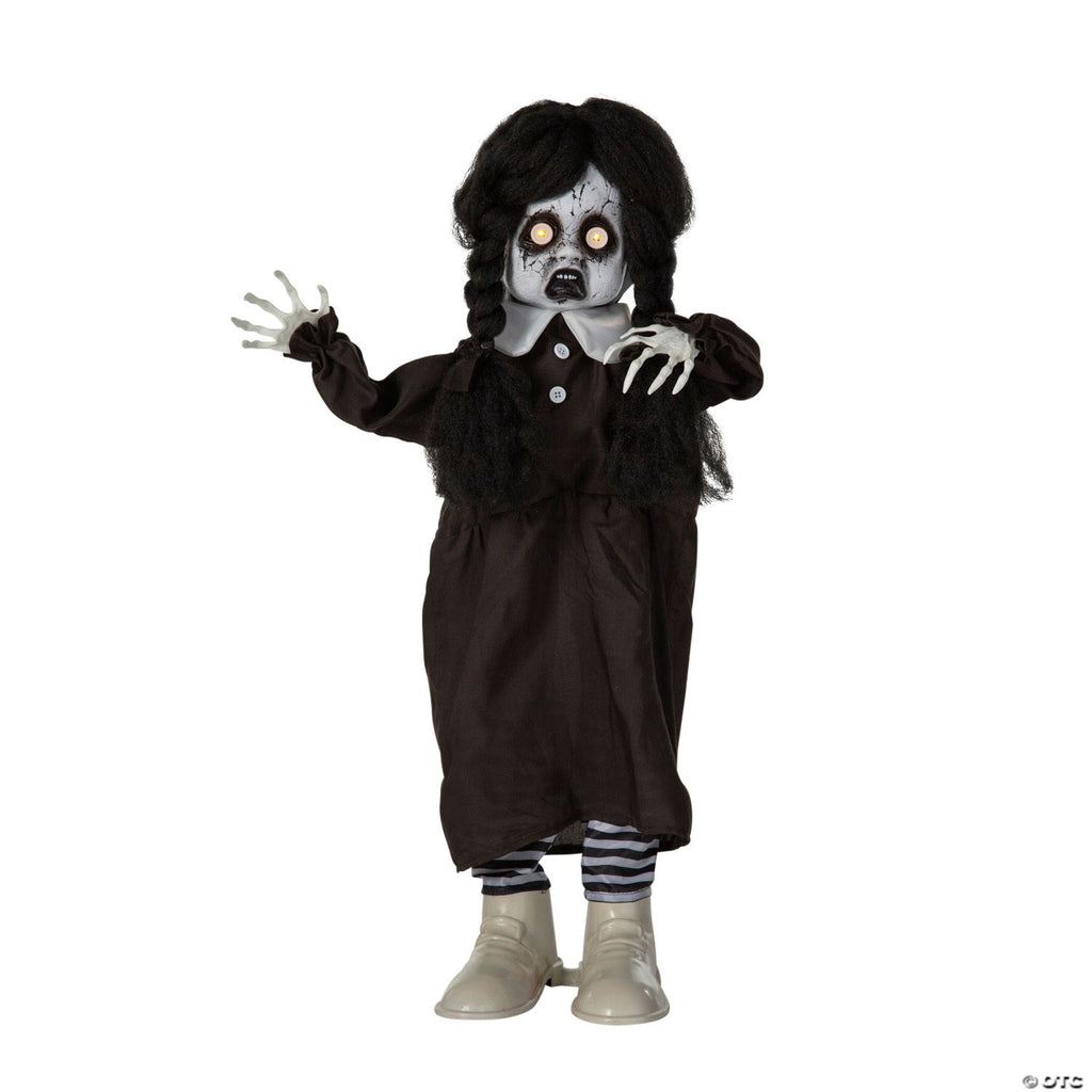 Playtime has never looked scarier! This Halloween decoration features a small girl in a black dress with white collar, black hair and black and white face. Her expression appears frozen in a scream, and she adds to her chilling look by laughing a creepy child’s laugh and playing a music box as she speaks the following phrases: “Do you wanna play? Come closer. I’ve got a secret.” Batteries required.