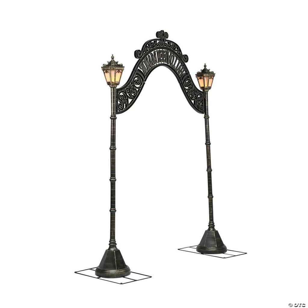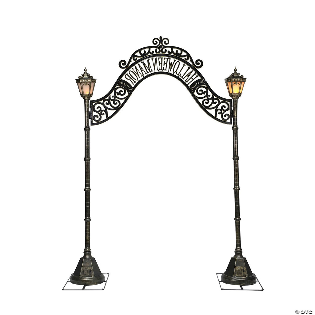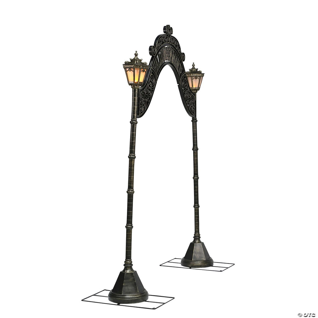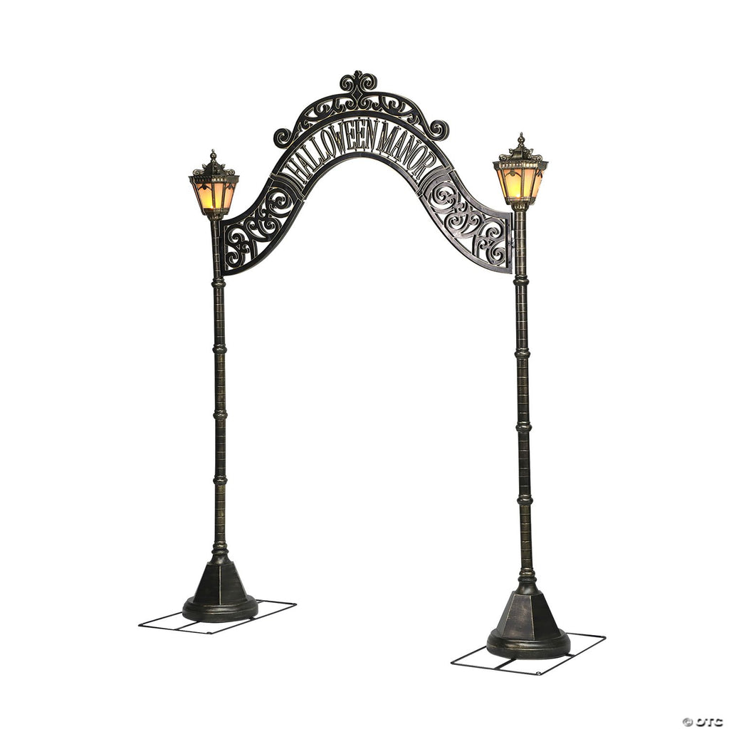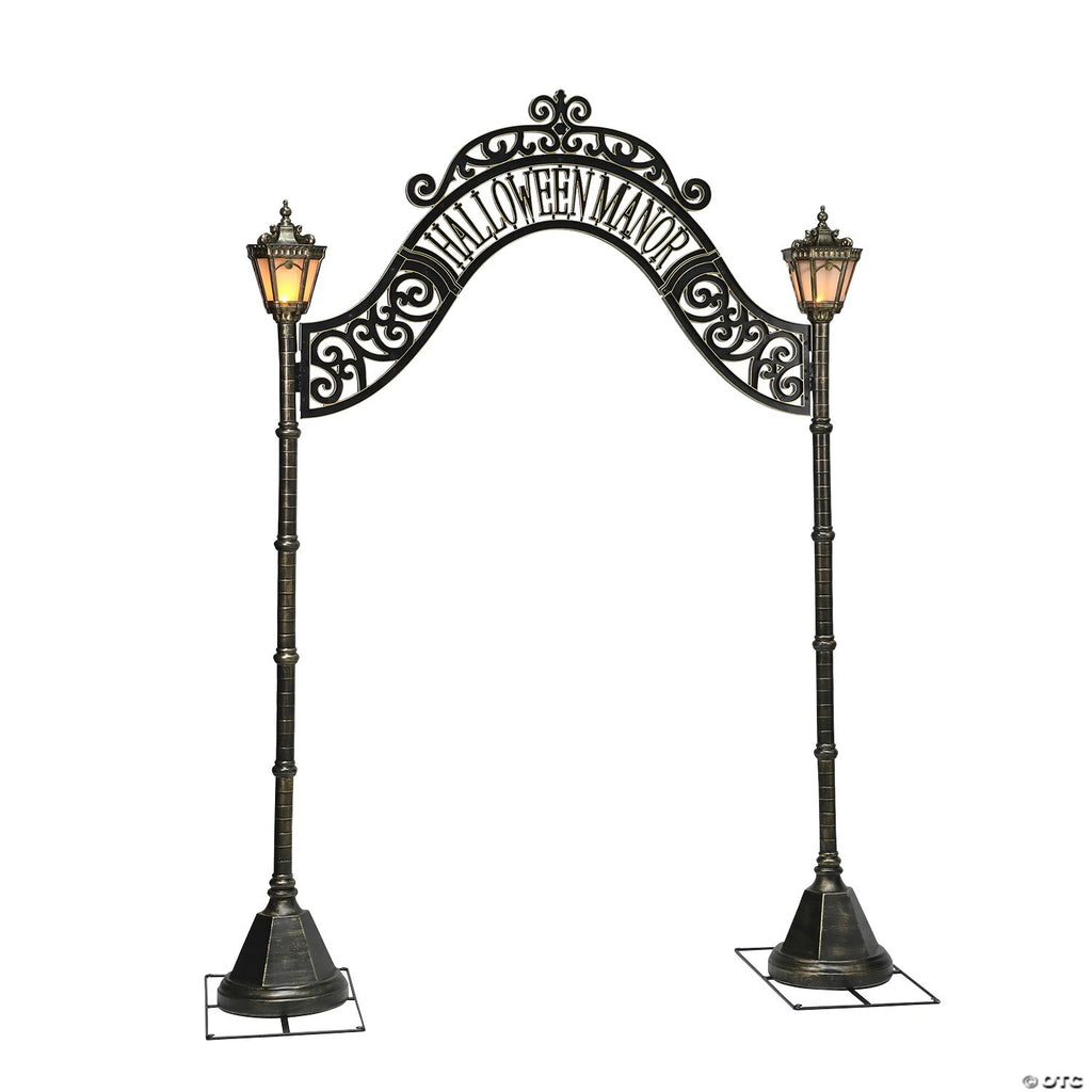 Here is the perfect entrance to your next Halloween haunted graveyard scene! Our Halloween Manor Archway Decoration sets a macabre mood with two tall lanterns that glow with a yellow flicking LED light on the tall support posts. They are connected by a decorative Halloween Manor Arch with gothic-looking scrollwork that you might see in a cemetery! The design gives the look of old ironwork in a black distressed finish. The wide sturdy bases give stability to the archway.