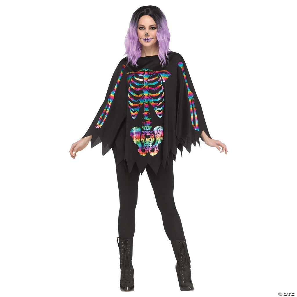 Unique poncho has a Halloween feel with rainbow colors! Our Rainbow Foil Skeleton Poncho hits below the hip with a jagged hemline. Printed rainbow foil skeleton on the front brings a colorful presence to your outfit! You can add a simple shirt and leggings for a really cool look. One size fits women's sizes 4-14.