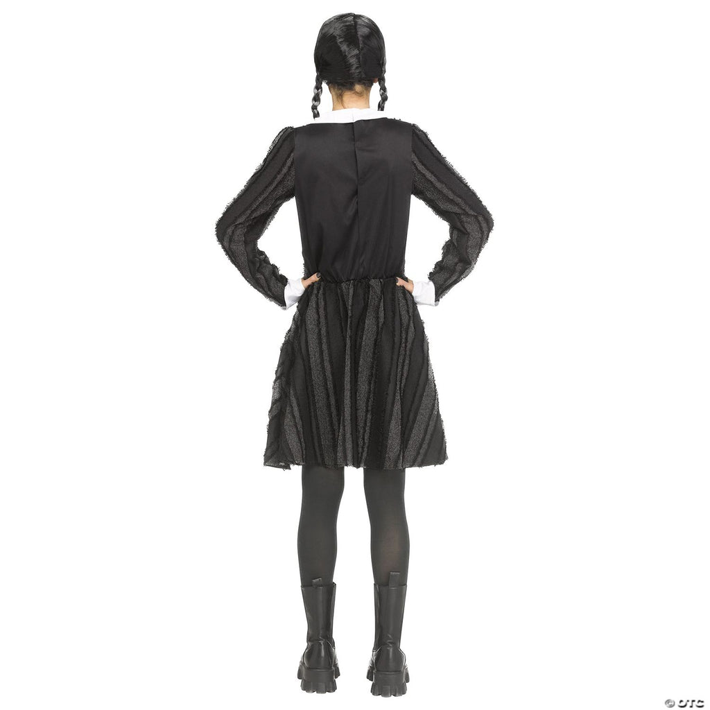 • CREATE UNSETTLING SCARE-PHOTOS: Use the costumes to craft eerie photo opportunities. Create spine-chilling keepsakes and social media posts that ensure the memories of a thrilling Halloween live on!br • FRIGHTEN AND DELIGHT TRICK-OR-TREATERS: Make trick-or-treating unforgettable for the neighborhood kids with costumes that add a dash of delightful dread to their sweet-treat-filled evening.br • TRANSFORM INTO CHILLING CHARACTERS: Plunge headlong into the world of your favorite eerie movies, TV shows, and video games by bringing their spine-chilling characters to life through our diverse range of costumes.br br Product Description:br Simple but slightly scary Creepy Coed dress in a grey and black stripe gives off that gothic vibe that is all the rage today! Crisp white collar and cuffs set off the mixed dark colors with the eyelash edges. Just add your dark tights and shoes for your custom look. Adult Medium/Large fits sizes 10-14.