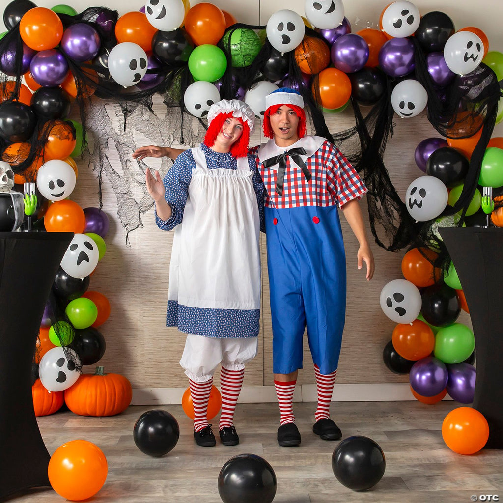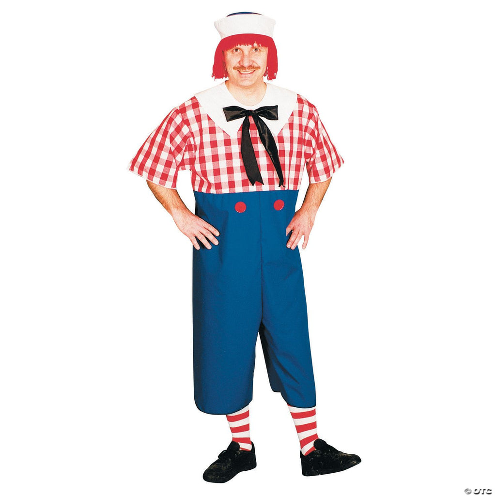 Family friendly fun costume for all! Our adult sized Raggedy Andy costume includes a one piece jumpsuit that looks like shirt and pants! Comes with a pair of striped stockings and a Raggedy Andy hat with attached yarn hair. Polyester. Fits most men up to size 42.