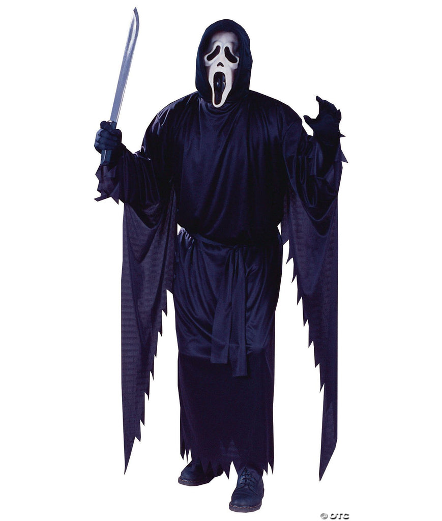 The frightening costume resembles the villian from the movie ''Scream''. The costume is a black, double knit, polyester robe with long, scalloped sleeves. The black hood is attached. Complete with ''Glow'' Scream Mask.br
