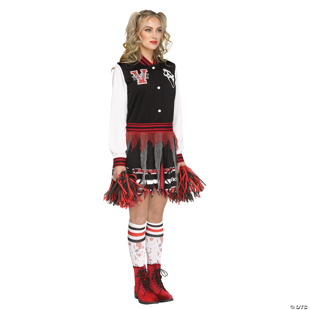 Fun Scream for the Team one-piece dress looks just like a cheerleader varsity jacket and skirt! Iconic spooky graphic prints show up on the front and back of the jacket. Wispy red and white gauze accents the waistline. Officially-licensed Ghost Face® costume comes with a matching pair of blood spattered socks and includes 2 red & black pom poms! Add your own shoes for the complete look. Adult Medium/Large fits sizes 10-14.
