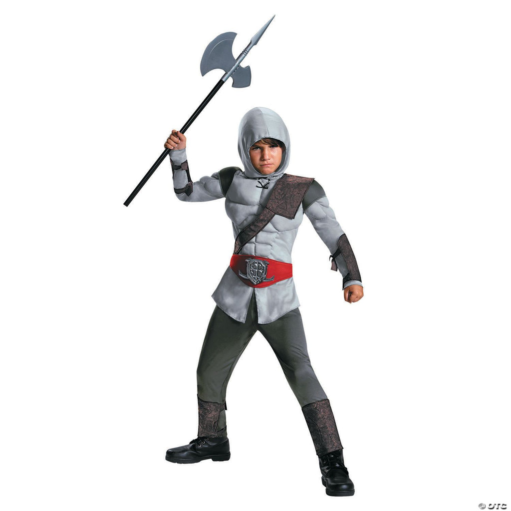 Jumpsuit with muscle torso and arms, belt with detachable buckle, chest strap, arm and shin guards, and character hood. Toy weapon not included.