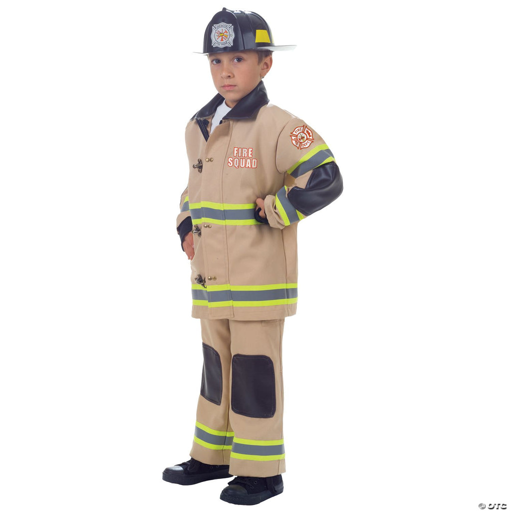Now your kids can dress up like a real firefighter with this authentic-looking Firefighter Costume. This child firefighter costume features a detailed tan jacket with matching pants and plastic helmet. Great costume for Halloween theatrical productions or career dress-up days at school! Boots not included.
