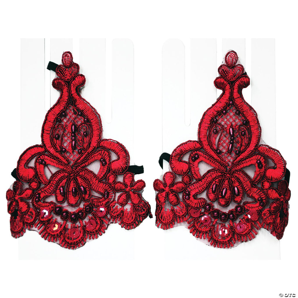 A great accessory for your day of the dead costume or for any costume with a certain Latino flair. Burgundy lace wristlet with beads and sequins has an elastic finger loop. Two elastic bands cross the wrist underneath to hold the decorative piece in place on the back of the hand. One size fits most.
