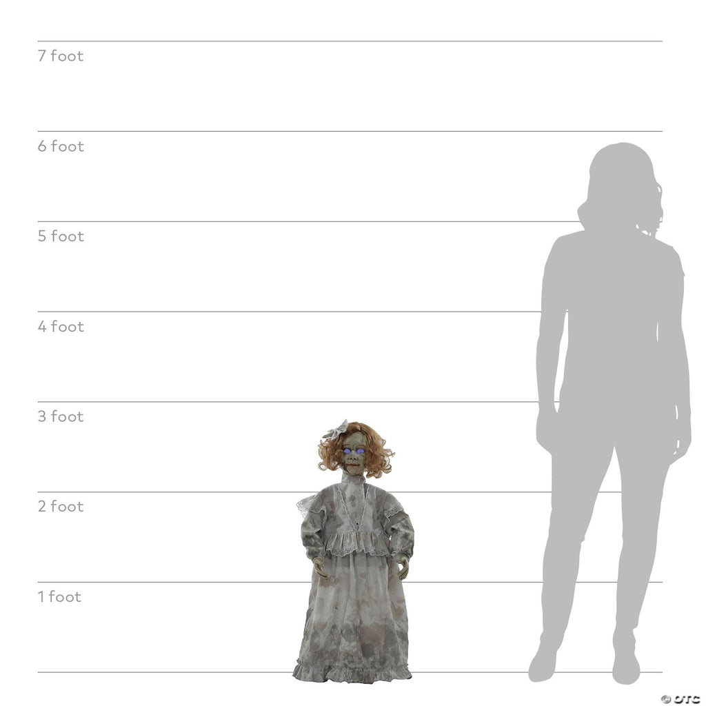 The perfect addition to any haunted house or horror-themed party! Standing at 32in tall the hollowed-out eyes of this static dreadful doll prop will glow an eerie blue as she says one of five phrases with each activation of her motion/light sensor such as -(Giggle) I just was thinking how funny you would look without eyes too.- Sally was mean to me once. Now...she'll never be mean again (giggle).- Ring around the rosy pocket full of posies, ashes, ashes we all fall down.- Hello there.(giggle), I see you. Features easy quick-connect push-button assembly and posable arms. Requires 3 AAA batteries (not included).