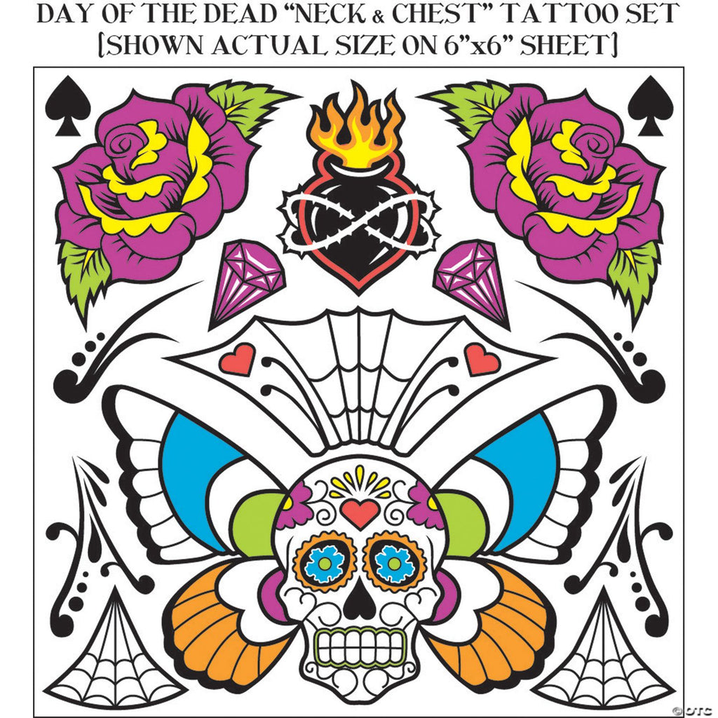 A great tattoo accessory kit for your Day of the Dead costume. Colorful tattoos for the body and top of the chest area. One size fits most.