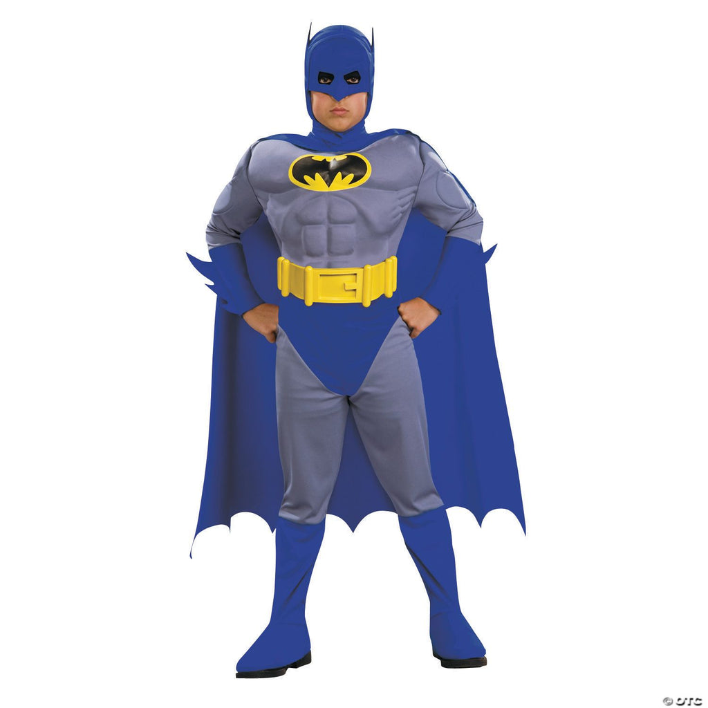 A fantastic-looking retro-styled Batman costume perfect for crime-fighting! Blue and grey muscle chest jumpsuit with yellow and black Batman insignia attached boot tops blue headpiece matching cape and yellow belt.