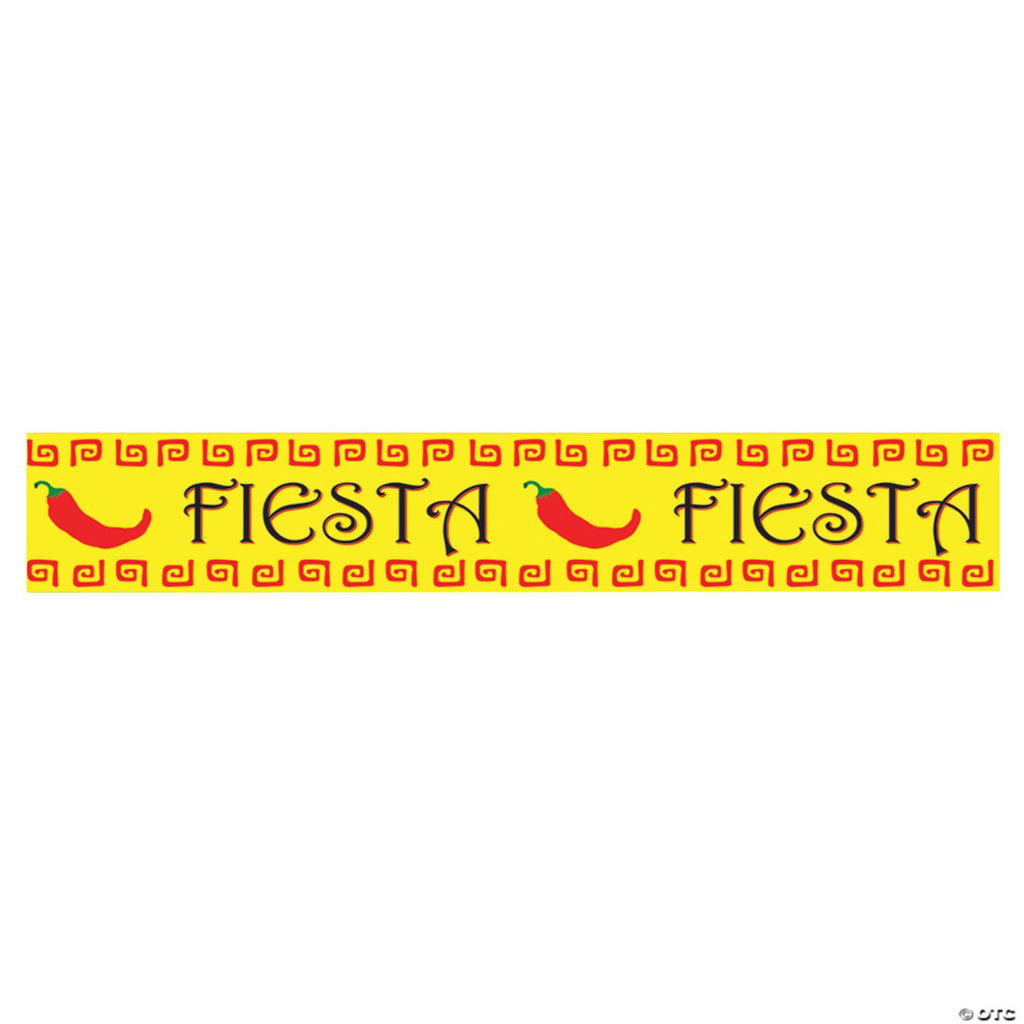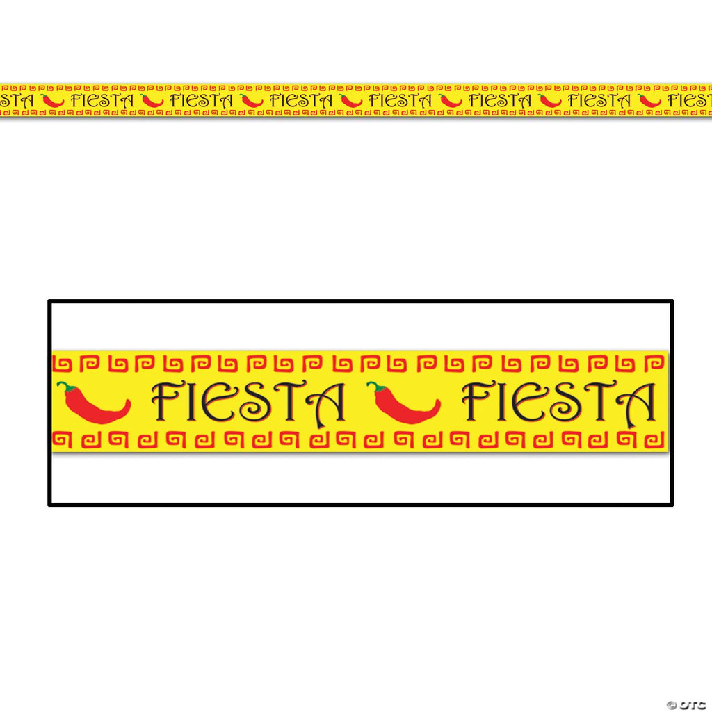 Fiesta . Add this to your fiesta party item! This party tape is made of all-weather plastic material. It has a yellow background with chili peppers and black lettering. The party tape measures 3" tall by 20 feet wide.