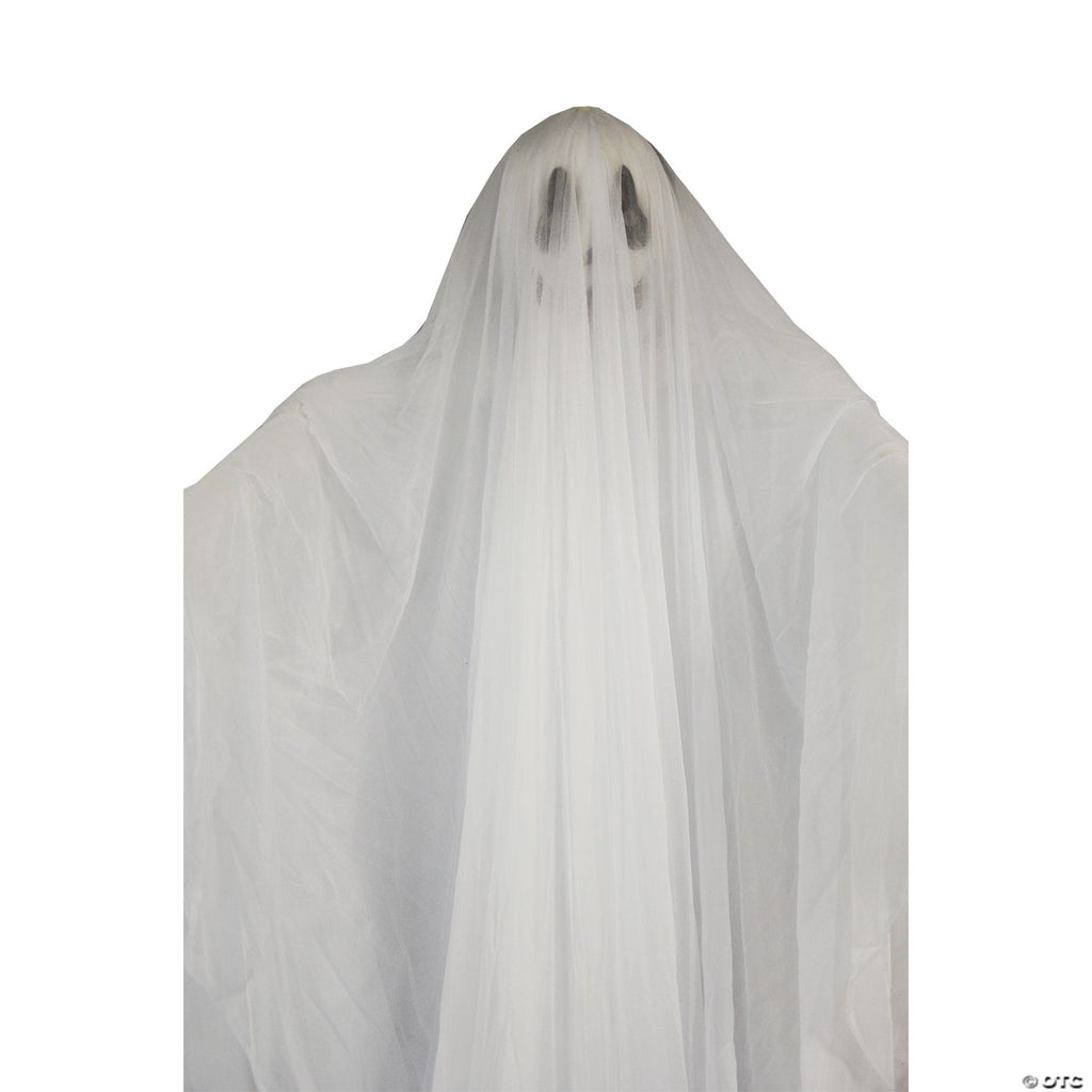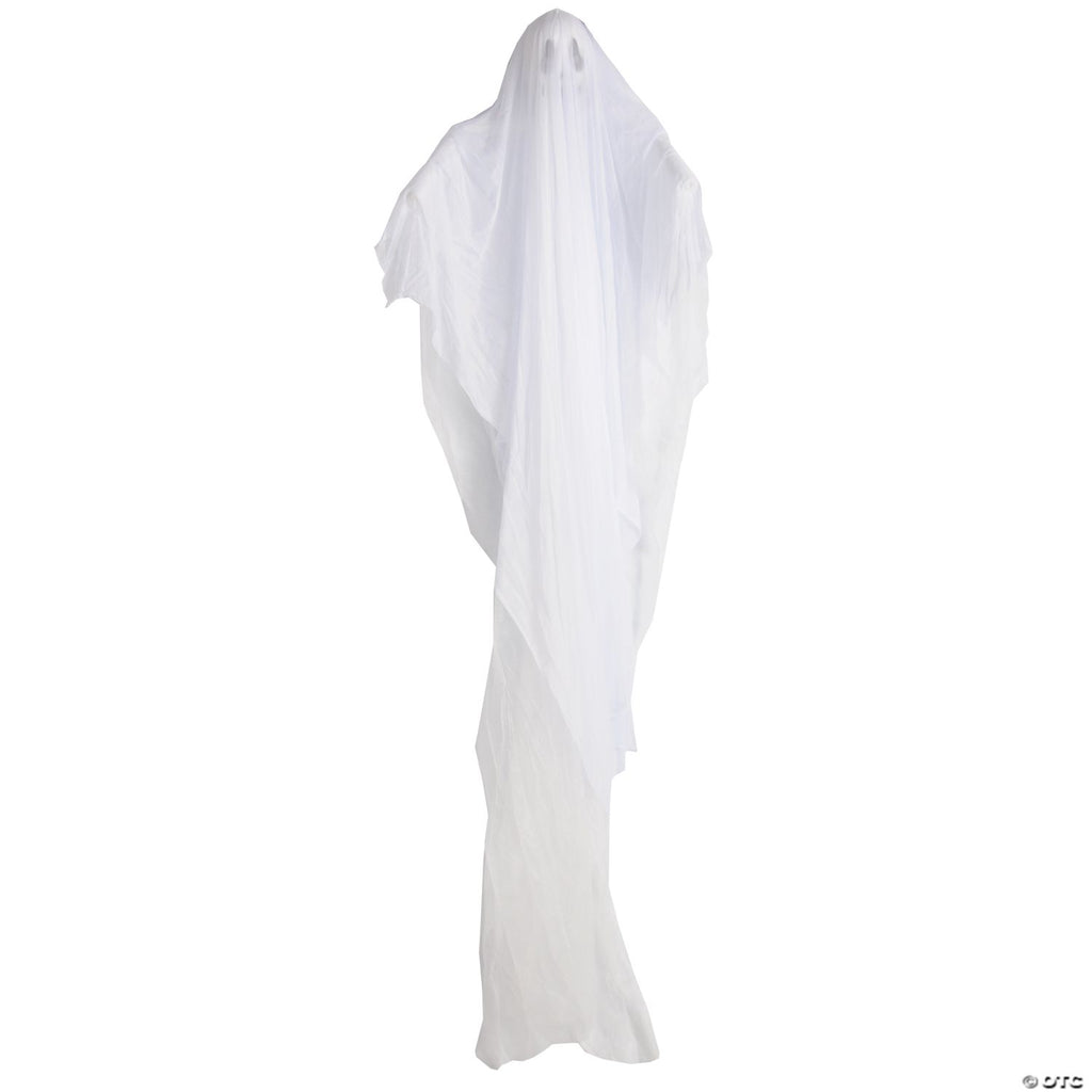 Ghostly figure has a long white robe with draping white fabric and a ghostly face showing through the fabric!With each breath of wind, the figure moves in aneerie way!Poseable arms reach out as if to get you!Prop is 7feet tall and 32 inches wide.