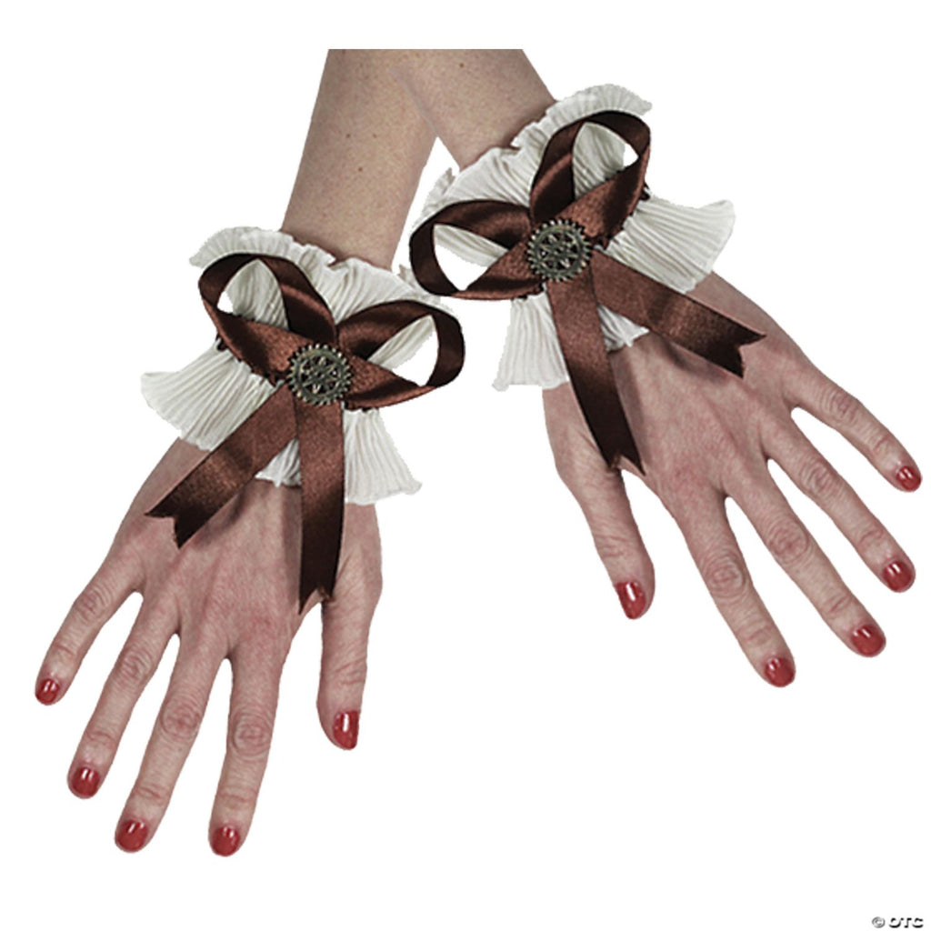 These ruffled wristlets embody the steampunk genre by combining vintage fashion with steam-powered machinery elements. The white ruffled lace wristlets are detailed with a brown ribbon and gold painted gear accent. These neo-Victorian wristlets are a great steampunk accessory to complete your costume! One size fits most.