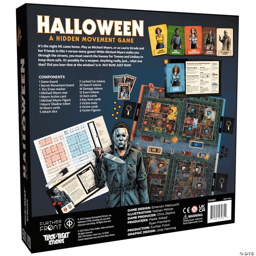It was the night HE came home... and one player must take on the role of Michael Myers! The others will control Laurie and her friends as they scramble to find weapons, the kids, and a way to escape. Their task will be made more difficult because Myers can only be seen when you're looking right at him! This 1 vs Many game by renowned designer Emerson Matsuuchi is the first time the original Halloween movie has been made into its own board game. Player Count: 2-4. Play Time: 60 minutes. © 2023 Compass International Pictures, Inc., Halloween (1978), including all associated characters and setting. All rights reserved.