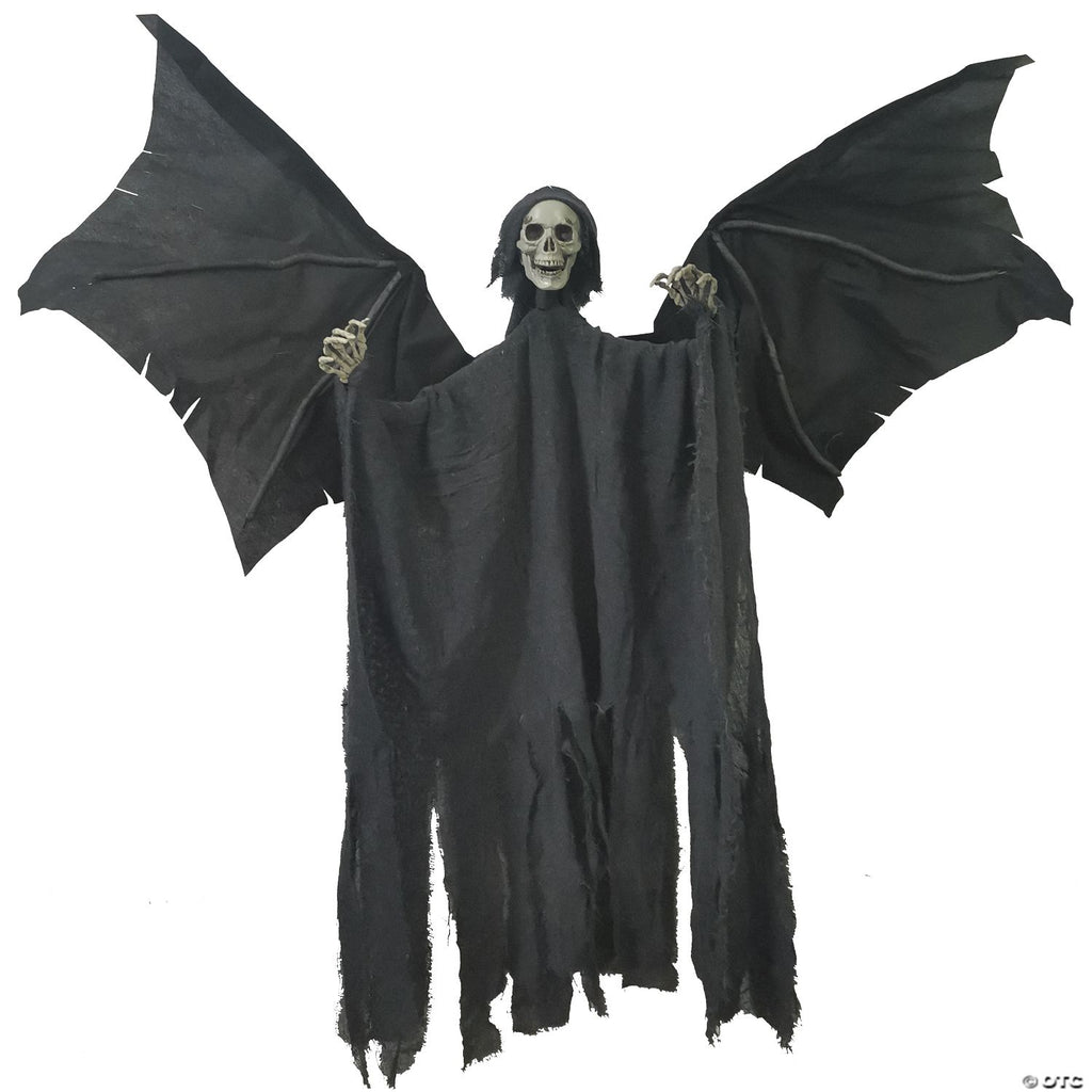 This Hanging Skeleton Reaper is the perfect addition to your spooky home décor! At 35 inches tall, this Grey Skeleton Reaper with Posable Wings is sure to make a spooky impression. The Greyish Plastic Skull and Skeletal Hands have an ancient-looking bone finish, while the large Black bat-like Wings make it appear to fly! Best of all, its Arms are Posable, so you can position it however you like. Hang it up on a string for a truly ghoulish display!